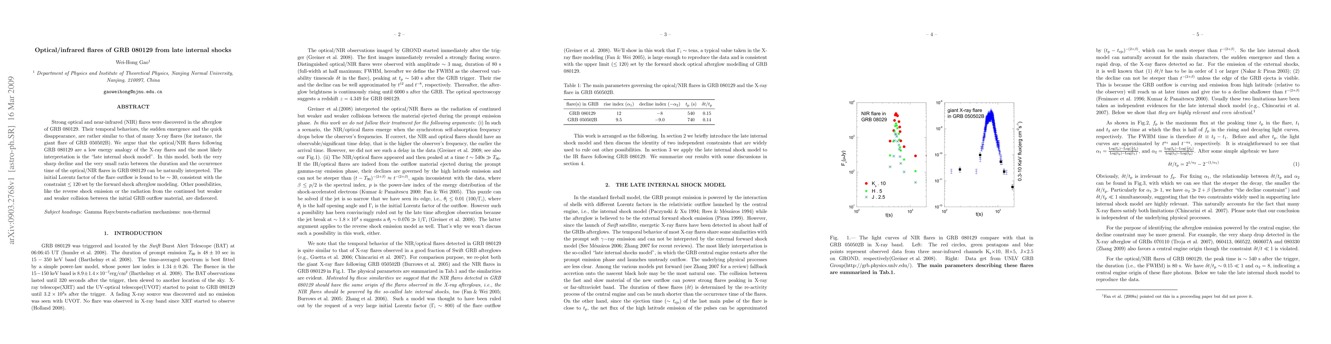 Strong optical and near-infrared (NIR) flares were discovered in the afterglow of GRB 080129. Their temporal behaviors, the sudden emergence and the quick disappearance, are rather similar to that of many X-ray flares (for instance, the giant flare of GRB 050502B). We argue that the optical/NIR flares following GRB 080129 are a low energy analogy of the X-ray flares and the most likely interpretation is the "late internal shock model". In this model, both the very sharp decline and the very small ratio between the duration and the occurrence time of the optical/NIR flares in GRB 080129 can be naturally interpreted. The initial Lorentz factor of the flare outflow is found to be $\sim 30$, consistent with the constraint $\leq 120$ set by the forward shock afterglow modeling. Other possibilities, like the reverse shock emission or the radiation from the continued but weaker and weaker collision between the initial GRB outflow material, are disfavored.