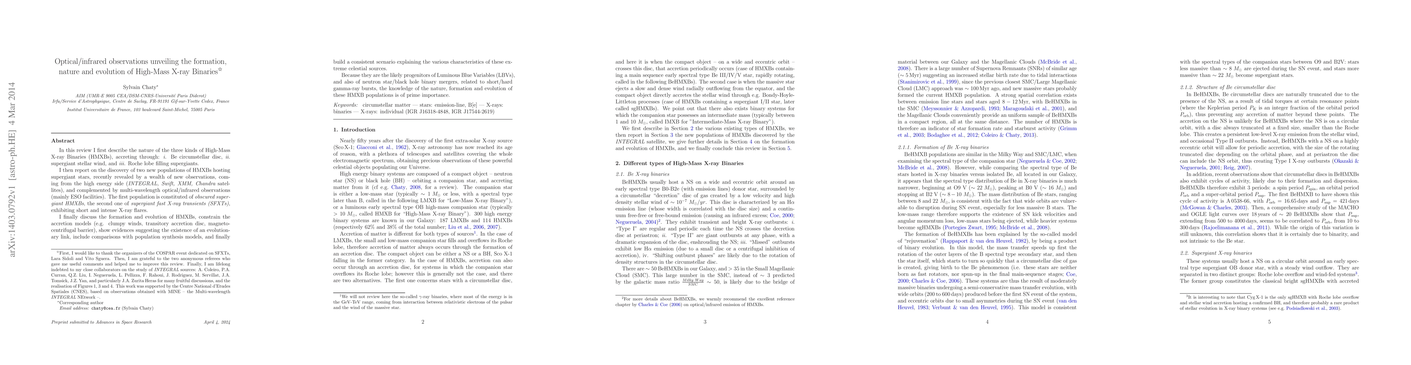 In this review I first describe the nature of the three kinds of High-Mass X-ray Binaries (HMXBs), accreting through: (i) Be circumstellar disc, (ii) supergiant stellar wind, and (iii) Roche lobe filling supergiants. I then report on the discovery of two new populations of HMXBs hosting supergiant stars, recently revealed by a wealth of new observations, coming from the high energy side (INTEGRAL, Swift, XMM, Chandra satellites), and complemented by multi-wavelength optical/infrared observations (mainly ESO facilities). The first population is constituted of obscured supergiant HMXBs, the second one of supergiant fast X-ray transients (SFXTs), exhibiting short and intense X-ray flares. I finally discuss the formation and evolution of HMXBs, constrain the accretion models (e.g. clumpy winds, transitory accretion disc, magneto-centrifugal barrier), show evidences suggesting the existence of an evolutionary link, include comparisons with population synthesis models, and finally build a consistent scenario explaining the various characteristics of these extreme celestial sources. Because they are the likely progenitors of Luminous Blue Variables (LBVs), and also of neutron star/black hole binary mergers, related to short/hard gamma-ray bursts, the knowledge of the nature, formation and evolution of these HMXB populations is of prime importance.