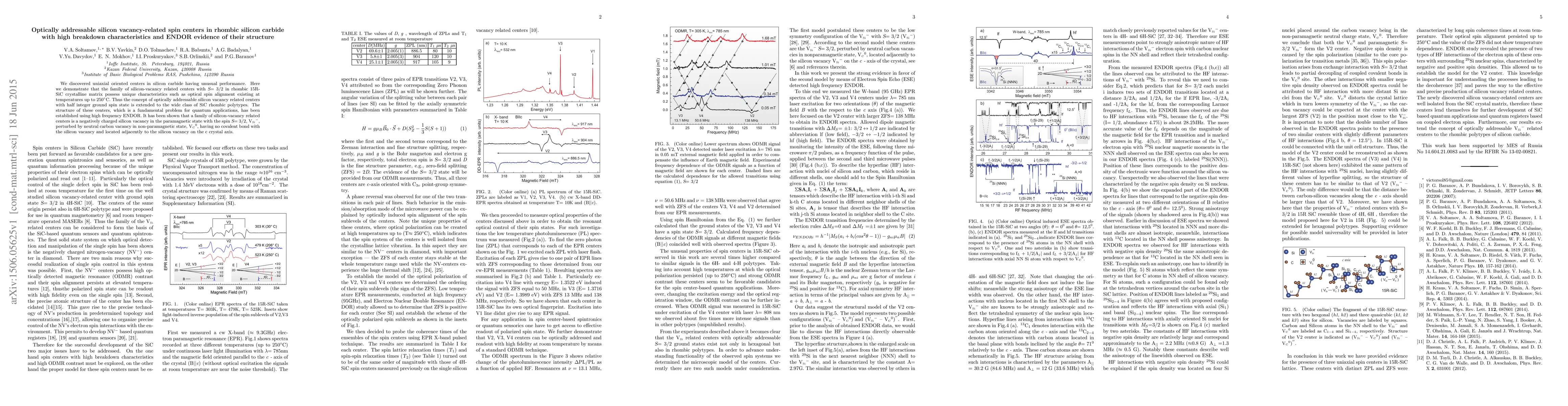 This paper reports on the discovery of optically addressable silicon vacancy-related spin centers in rhombic silicon carbide, demonstrating their unique optical and magnetic properties, including high breakdown characteristics and structural confirmation via high-frequency ENDOR. The centers are identified as negatively charged silicon vacancies perturbed by adjacent neutral carbon vacancies.