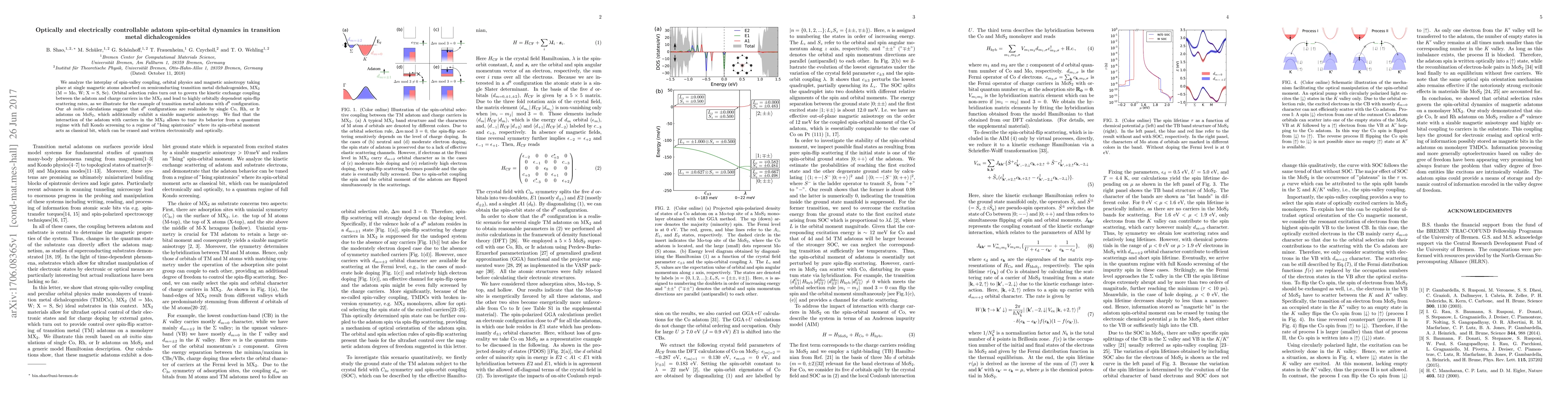 We analyze the interplay of spin-valley coupling, orbital physics and magnetic anisotropy taking place at single magnetic atoms adsorbed on semiconducting transition-metal dichalcogenides, MX$_2$ (M = Mo, W; X = S, Se). Orbital selection rules turn out to govern the kinetic exchange coupling between the adatom and charge carriers in the MX$_2$ and lead to highly orbitally dependent spin-flip scattering rates, as we illustrate for the example of transition metal adatoms with $d^9$ configuration. Our ab initio calculations suggest that $d^9$ configurations are realizable by single Co, Rh, or Ir adatoms on MoS$_2$, which additionally exhibit a sizable magnetic anisotropy. We find that the interaction of the adatom with carriers in the MX$_2$ allows to tune its behavior from a quantum regime with full Kondo screening to a regime of "Ising spintronics" where its spin-orbital moment acts as classical bit, which can be erased and written electronically and optically.