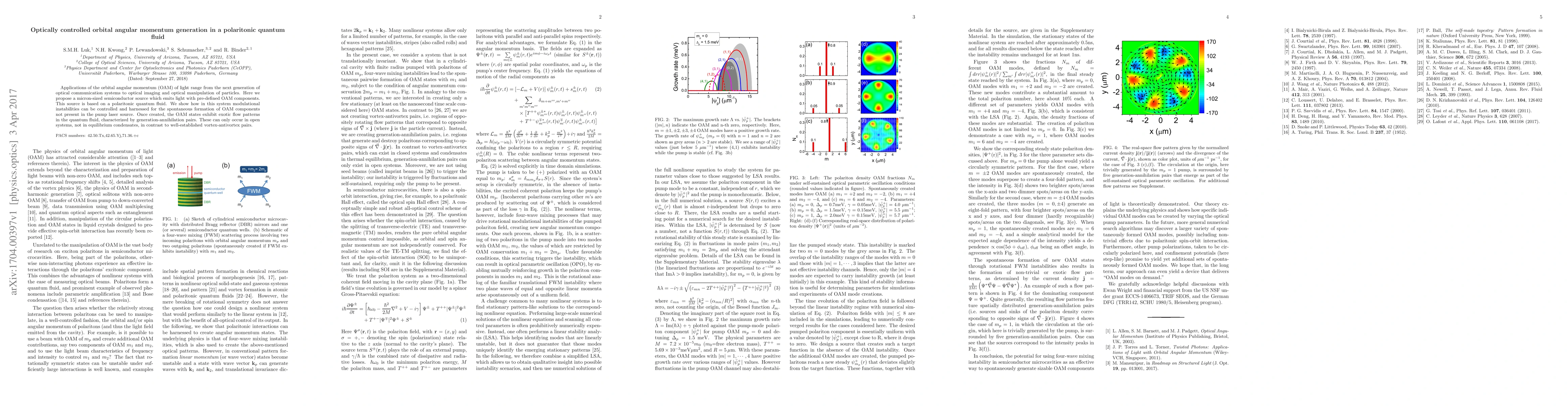This paper proposes a micron-sized semiconductor source that generates light with pre-defined orbital angular momentum (OAM) using a polaritonic quantum fluid. It demonstrates how modulational instabilities can create spontaneous OAM components not present in the pump laser, leading to unique flow patterns in the quantum fluid.