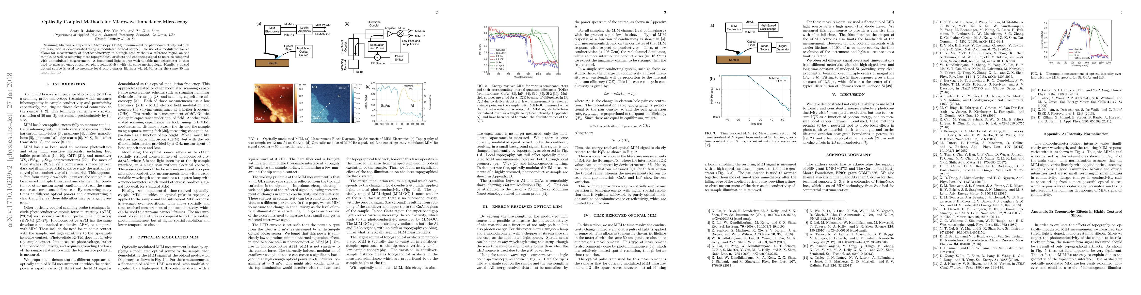 This paper demonstrates Scanning Microwave Impedance Microscopy (MIM) using optically coupled methods to achieve 50 nm resolution in photoconductivity measurements. It highlights the use of modulated optical sources to enhance signal-to-noise ratio and eliminate topographical artifacts, followed by broadband light source measurements for energy-resolved photoconductivity and pulsed optical sources for local photo-carrier lifetimes.