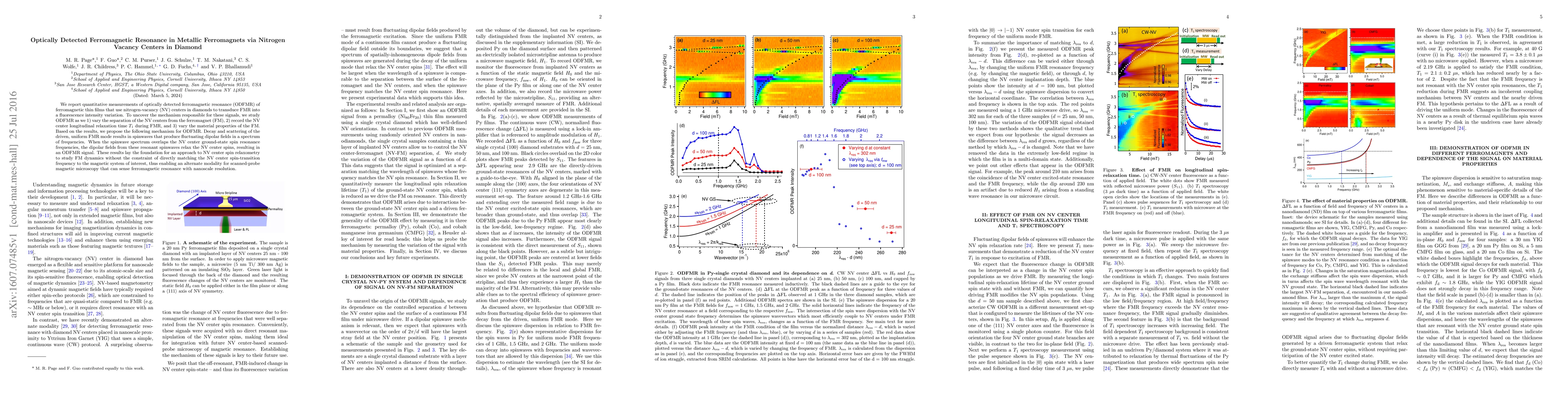 This paper reports quantitative measurements of optically detected ferromagnetic resonance (ODFMR) in metallic ferromagnets using nitrogen-vacancy centers in diamonds, proposing a mechanism where spinwaves from FMR induce fluctuating dipolar fields that relax NV center spins, enabling nanoscale magnetic microscopy.