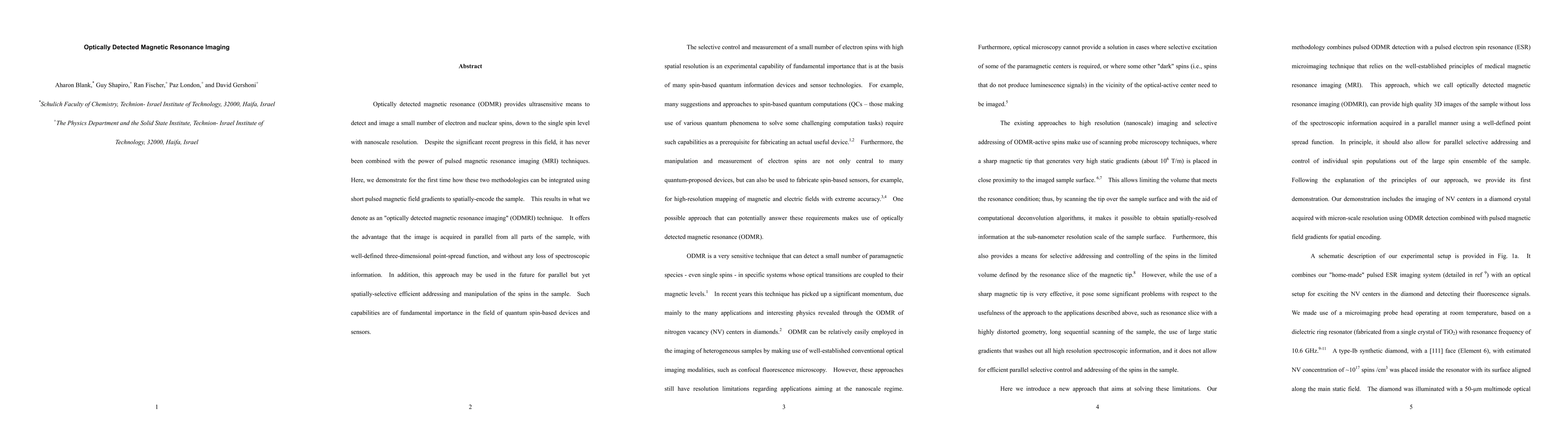 This paper introduces a novel "optically detected magnetic resonance imaging" (ODMRI) technique that integrates ultrasensitive optically detected magnetic resonance (ODMR) with pulsed magnetic resonance imaging (MRI) using short pulsed magnetic field gradients. This method allows for parallel imaging of all parts of a sample with nanoscale resolution and without loss of spectroscopic information, potentially enabling future spatially-selective manipulation of spins in quantum spin-based devices.