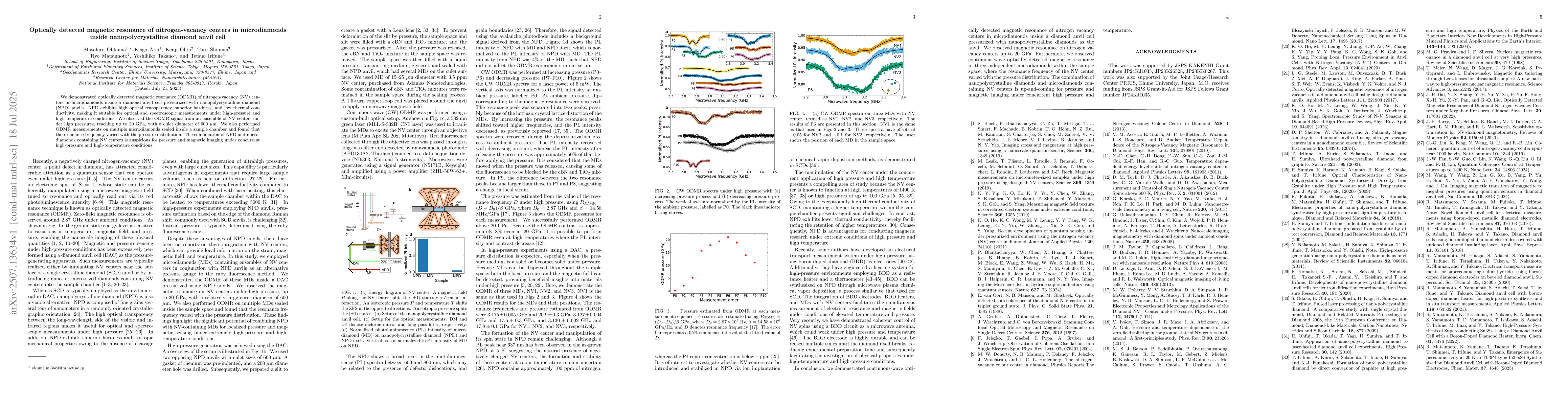We demonstrated optically detected magnetic resonance (ODMR) of nitrogen-vacancy (NV) centers in microdiamonds inside a diamond anvil cell pressurized with nanopolycrystalline diamond (NPD) anvils. NPD exhibits high optical transparency, superior hardness, and low thermal conductivity, making it suitable for optical and spectroscopic measurements under high-pressure and high-temperature conditions. We observed the ODMR signal from an ensemble of NV centers under high pressures, reaching up to 20 GPa, with a culet diameter of 600 $\mu$m. We also performed ODMR measurements on multiple microdiamonds sealed inside a sample chamber and found that the resonance frequency varied with the pressure distribution. The combination of NPD and microdiamonds containing NV centers is auspicious for pressure and magnetic imaging under concurrent high-pressure and high-temperature conditions.
