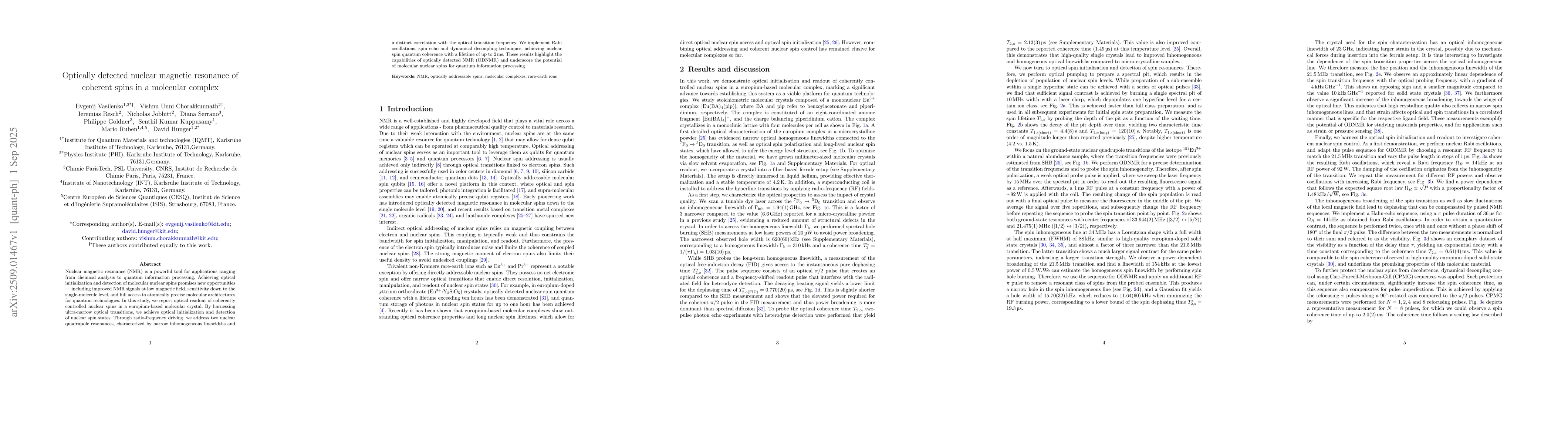 Nuclear magnetic resonance (NMR) is a powerful tool for applications ranging from chemical analysis to quantum information processing. Achieving optical initialization and detection of molecular nuclear spins promises new opportunities - including improved NMR signals at low magnetic field, sensitivity down to the single-molecule level, and full access to atomically precise molecular architectures for quantum technologies. In this study, we report optical readout of coherently controlled nuclear spins in a europium-based molecular crystal. By harnessing ultra-narrow optical transitions, we achieve optical initialization and detection of nuclear spin states. Through radio-frequency driving, we address two nuclear quadrupole resonances, characterized by narrow inhomogeneous linewidths and a distinct correlation with the optical transition frequency. We implement Rabi oscillations, spin echo and dynamical decoupling techniques, achieving nuclear spin quantum coherence with a lifetime of up to 2 ms. These results highlight the capabilities of optically detected NMR (ODNMR) and underscore the potential of molecular nuclear spins for quantum information processing.