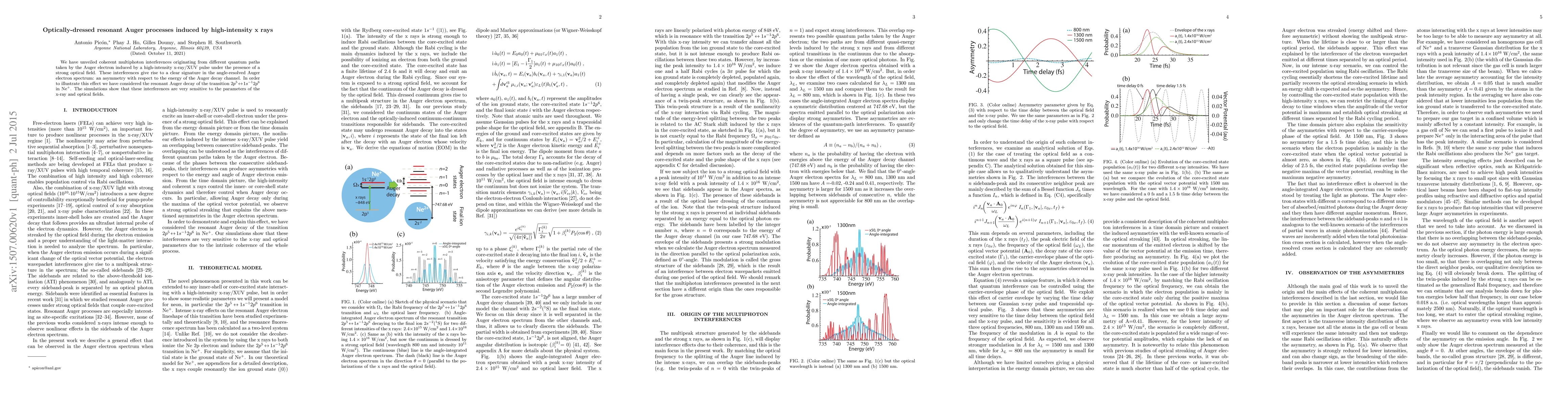 We have unveiled coherent multiphoton interferences originating from different quantum paths taken by the Auger electron induced by a high-intensity x-ray/XUV pulse under the presence of a strong optical field. These interferences give rise to a clear signature in the angle-resolved Auger electron spectrum: an asymmetry with respect to the energy of the Auger decay channel. In order to illustrate this effect we have considered the resonant Auger decay of the transition $2p^{5} \!\leftrightarrow\! 1s^{-1}2p^{6}$ in Ne$^{+}$. The simulations show that these interferences are very sensitive to the parameters of the x-ray and optical fields.