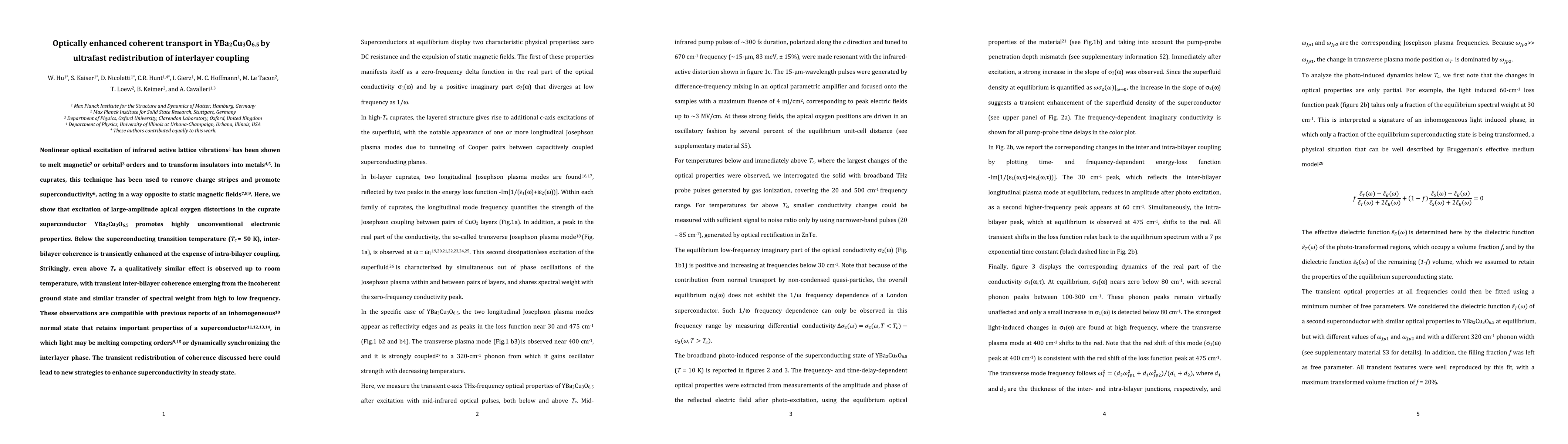 Nonlinear optical excitation of infrared active lattice vibrations has been shown to melt magnetic or orbital orders and to transform insulators into metals. In cuprates, this technique has been used to remove charge stripes and promote superconductivity, acting in a way opposite to static magnetic fields. Here, we show that excitation of large-amplitude apical oxygen distortions in the cuprate superconductor YBa2Cu3O6.5 promotes highly unconventional electronic properties. Below the superconducting transition temperature (Tc = 50 K), interbilayer coherence is transiently enhanced at the expense of intra-bilayer coupling. Strikingly, even above Tc a qualitatively similar effect is observed up to room temperature, with transient inter-bilayer coherence emerging from the incoherent ground state and similar transfer of spectral weight from high to low frequency. These observations are compatible with previous reports of an inhomogeneous normal state that retains important properties of a superconductor, in which light may be melting competing orders or dynamically synchronizing the interlayer phase. The transient redistribution of coherence discussed here could lead to new strategies to enhance superconductivity in steady state.