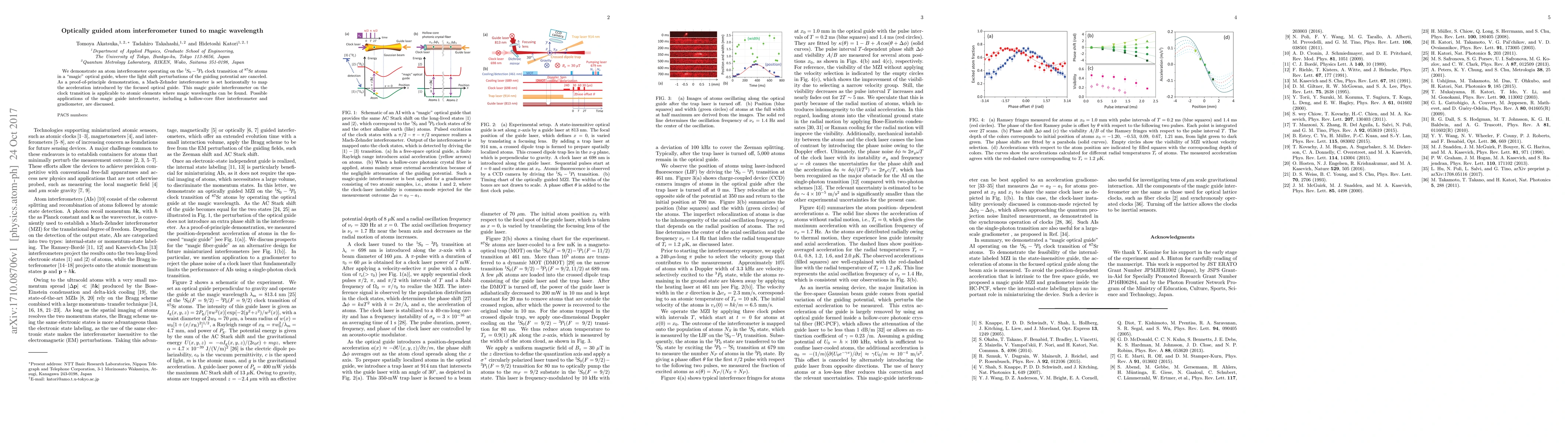 We demonstrate an atom interferometer operating on the $^1S_0-{}^3P_0$ clock transition of $^{87}$Sr atoms in a "magic" optical guide, where the light shift perturbations of the guiding potential are canceled. As a proof-of-principle demonstration, a Mach-Zehnder interferometer is set horizontally to map the acceleration introduced by the focused optical guide. This magic guide interferometer on the clock transition is applicable to atomic elements where magic wavelengths can be found. Possible applications of the magic guide interferometer, including a hollow-core fiber interferometer and gradiometer, are discussed.