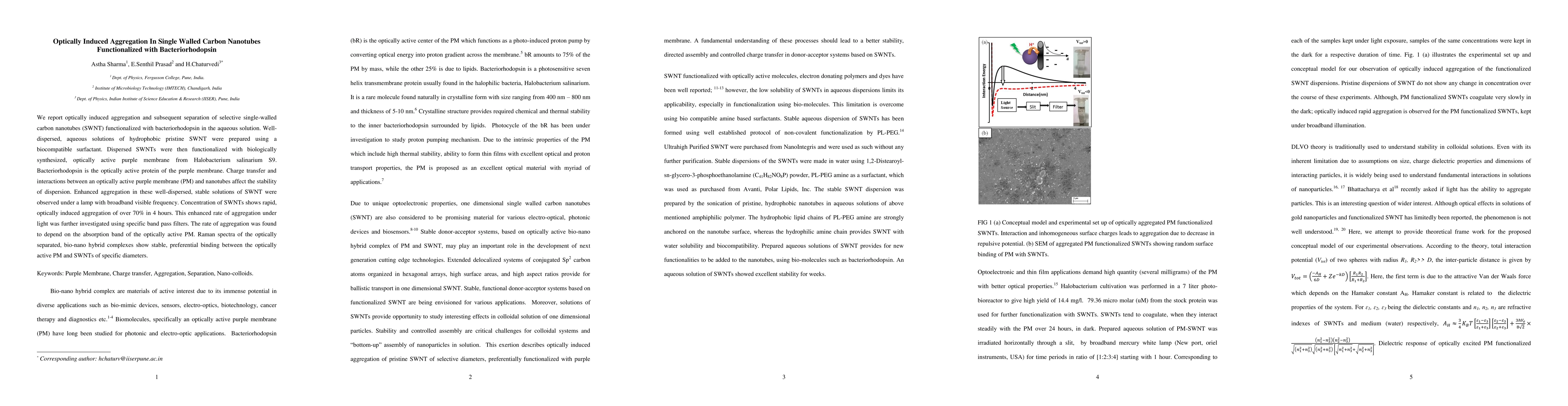 This study reports the optically induced aggregation and separation of single-walled carbon nanotubes (SWNTs) functionalized with bacteriorhodopsin, which is derived from purple membrane of Halobacterium salinarium. Under broadband visible light, over 70% of SWNTs aggregated within 4 hours, with the rate influenced by the absorption band of bacteriorhodopsin.