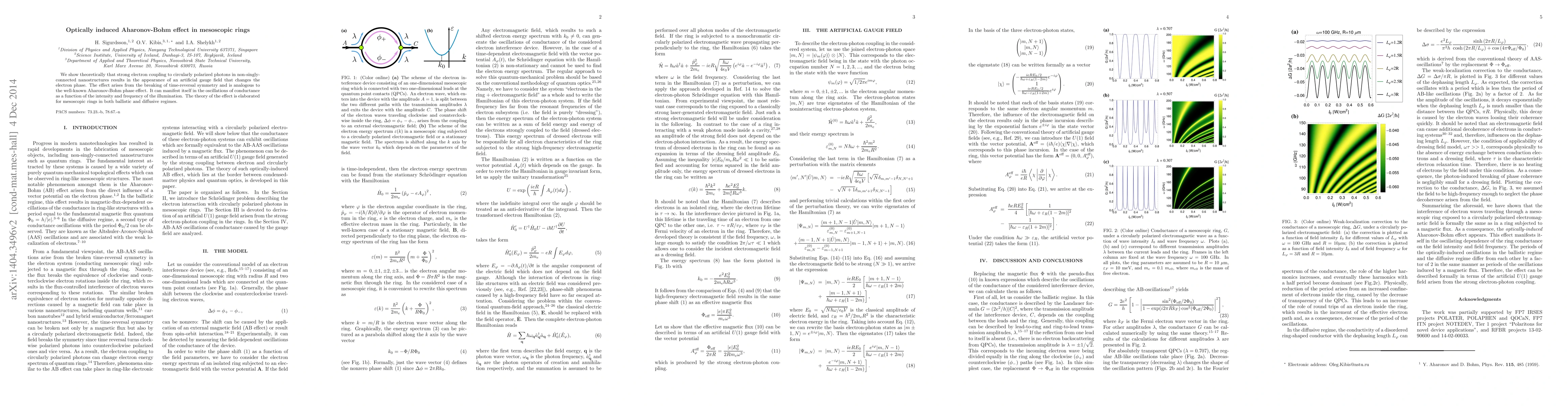 This paper theoretically demonstrates that coupling of electrons to circularly polarized photons in mesoscopic rings creates an artificial gauge field, leading to an optically induced Aharonov-Bohm effect that modifies electron phase. This effect, arising from broken time-reversal symmetry, manifests as conductance oscillations dependent on illumination intensity and frequency.