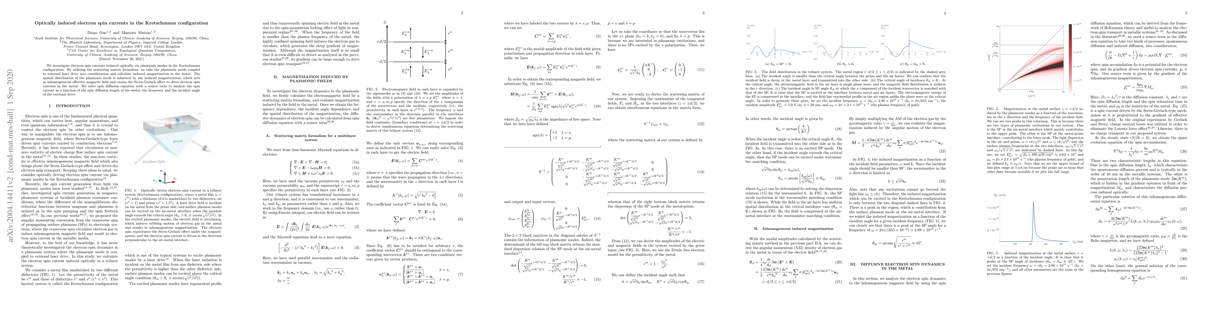 This paper explores the optically induced electron spin currents in the Kretschmann configuration through plasmonic modes, utilizing scattering matrix formalism. The study reveals that the induced magnetisation from plasmonic modes generates an effective magnetic field, driving electron spin currents, which are analyzed via the spin diffusion equation.