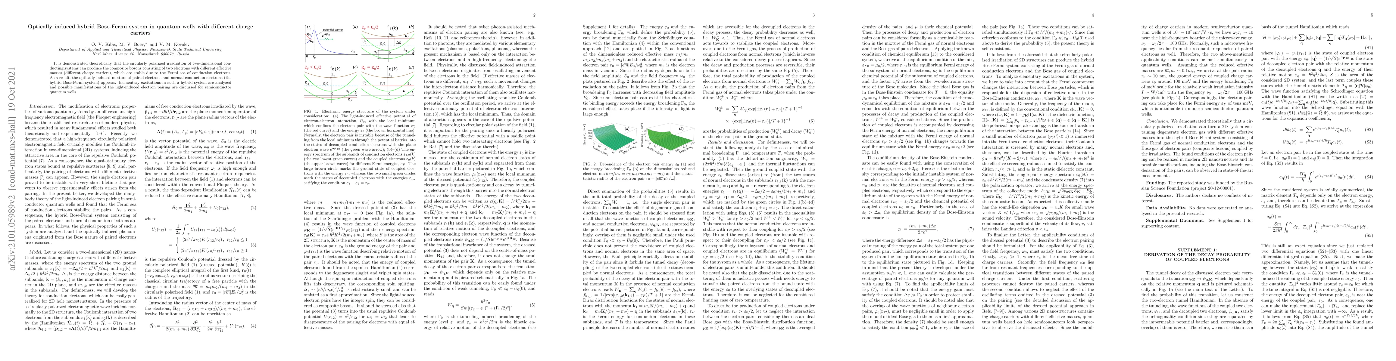 This paper theoretically demonstrates that circularly polarized light can induce a hybrid Bose-Fermi system in quantum wells, where composite bosons form from paired electrons with different effective masses, stabilized by the conduction electron Fermi sea. The study analyzes the elementary excitations and potential light-induced electron pairing effects in semiconductor quantum wells.