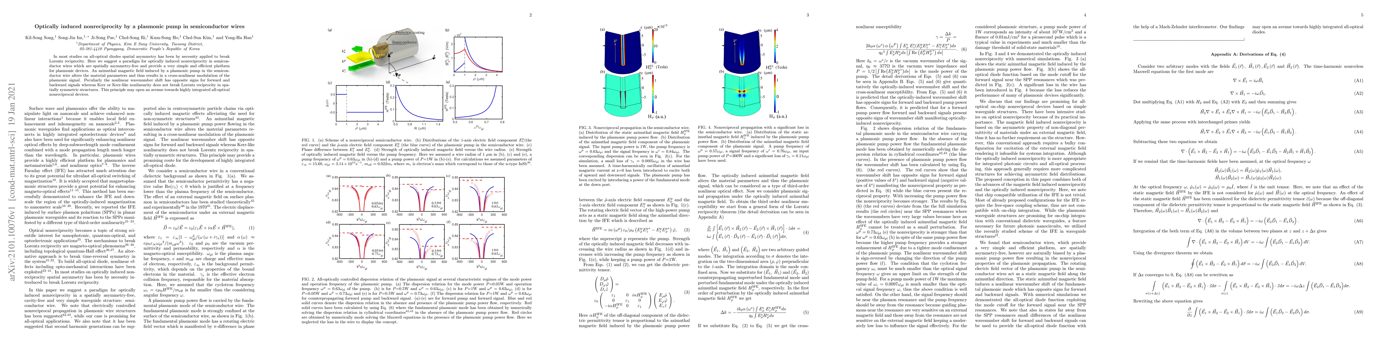 This paper proposes an optically induced nonreciprocity mechanism in semiconductor wires using a plasmonic pump to create an azimuthal magnetic field, which alters material parameters and results in a cross-nonlinear modulation of the plasmonic signal, breaking Lorentz reciprocity without spatial asymmetry. This approach may lead to highly integrated all-optical nonreciprocal devices.