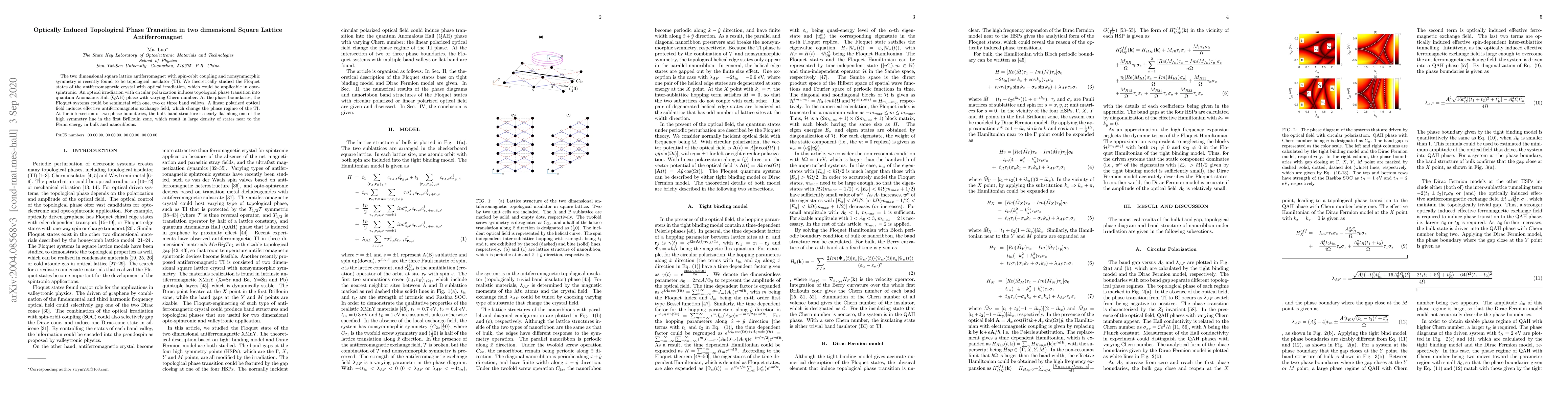 Researchers studied the effect of optical irradiation on a 2D square lattice antiferromagnet, inducing a topological phase transition into a quantum Anomalous Hall phase with varying Chern numbers.