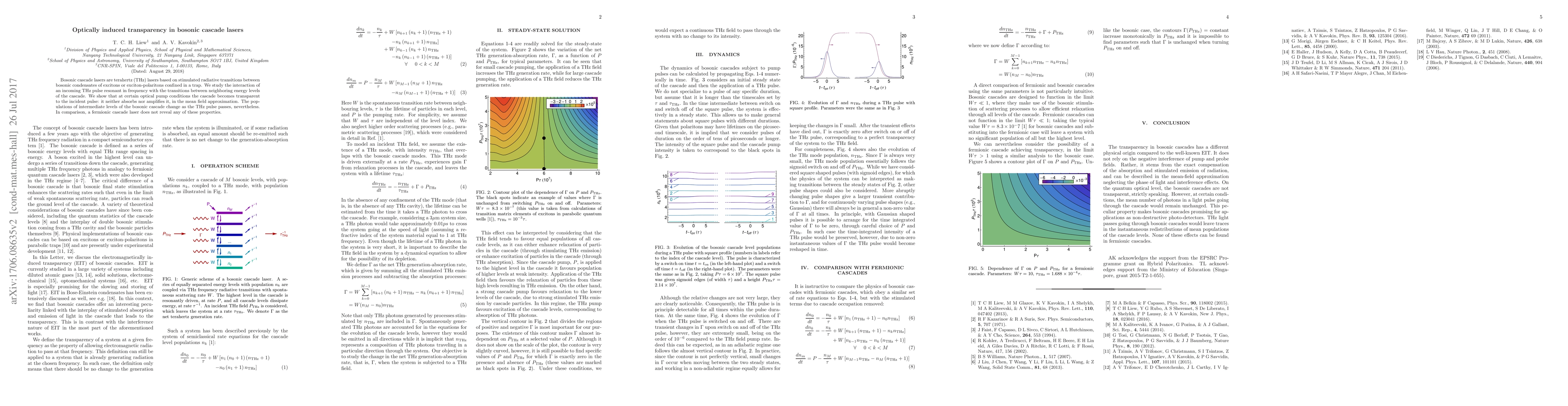 This paper investigates bosonic cascade lasers where a THz pulse resonant with transitions between energy levels induces transparency, meaning the pulse neither absorbs nor amplifies, under specific optical pump conditions. Unlike fermionic cascade lasers, the bosonic ones exhibit this unique transparency behavior while altering intermediate level populations.