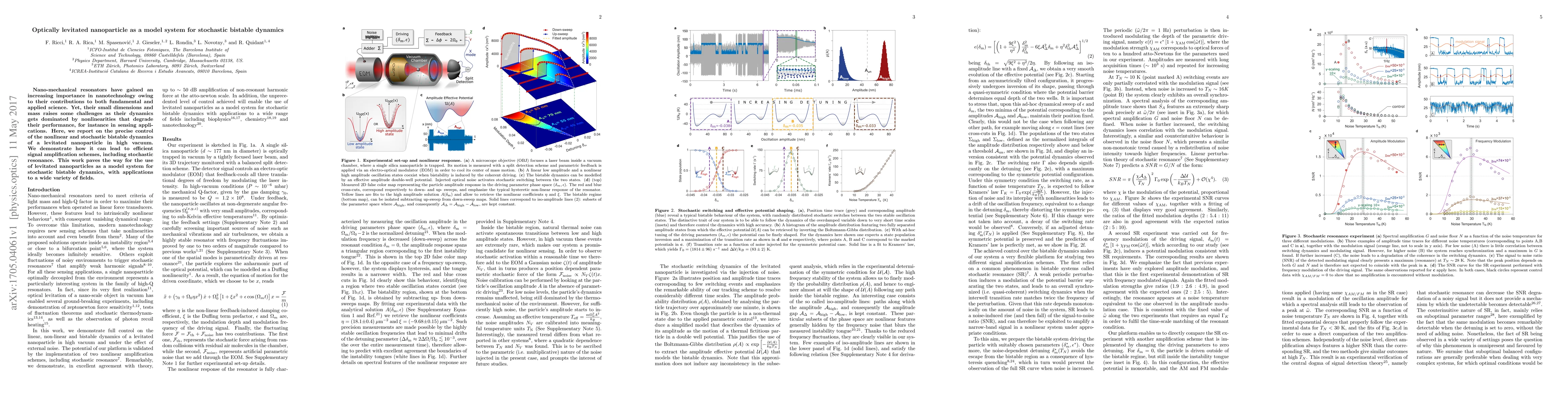 This paper investigates the nonlinear and stochastic bistable dynamics of optically levitated nanoparticles, demonstrating precise control over their dynamics in high vacuum. The study shows how these dynamics can enable efficient signal amplification and stochastic resonance, positioning levitated nanoparticles as a model system for stochastic bistable dynamics with broad applications.
