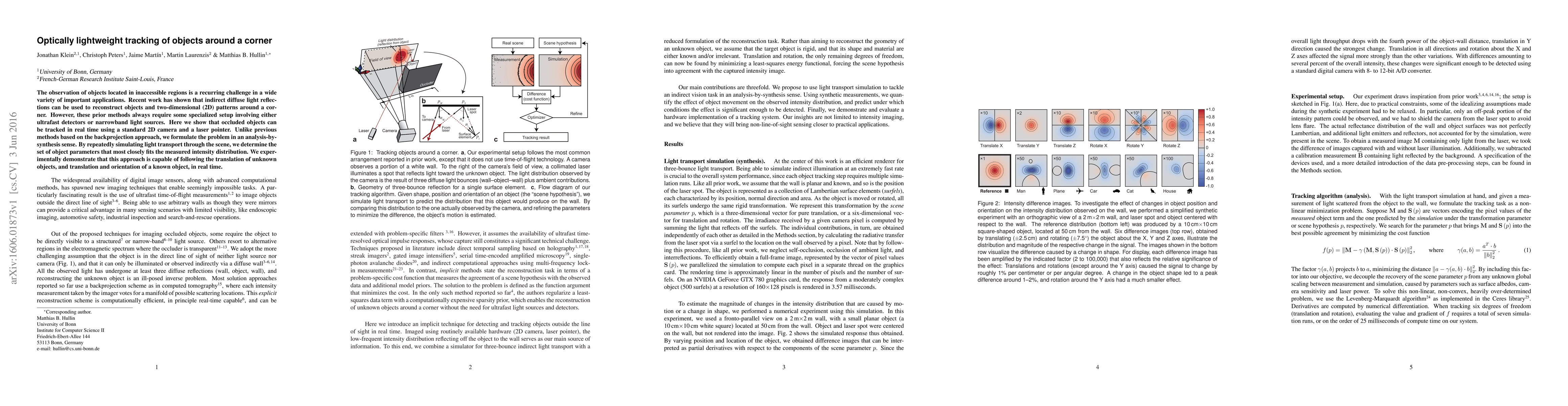 The observation of objects located in inaccessible regions is a recurring challenge in a wide variety of important applications. Recent work has shown that indirect diffuse light reflections can be used to reconstruct objects and two-dimensional (2D) patterns around a corner. However, these prior methods always require some specialized setup involving either ultrafast detectors or narrowband light sources. Here we show that occluded objects can be tracked in real time using a standard 2D camera and a laser pointer. Unlike previous methods based on the backprojection approach, we formulate the problem in an analysis-by-synthesis sense. By repeatedly simulating light transport through the scene, we determine the set of object parameters that most closely fits the measured intensity distribution. We experimentally demonstrate that this approach is capable of following the translation of unknown objects, and translation and orientation of a known object, in real time.
