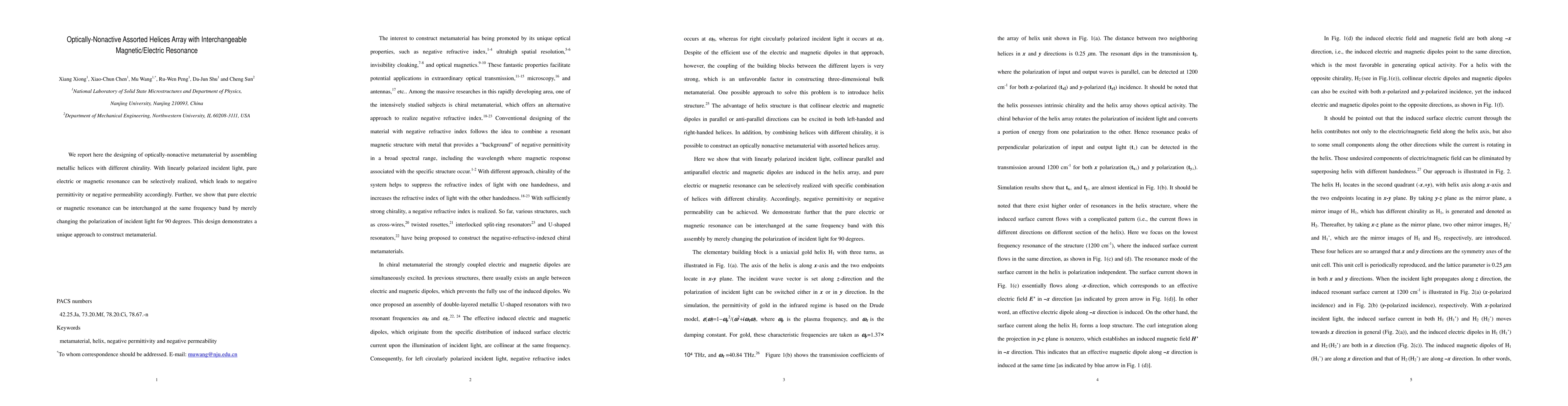We report here the designing of optically-nonactive metamaterial by assembling metallic helices with different chirality. With linearly polarized incident light, pure electric or magnetic resonance can be selectively realized, which leads to negative permittivity or negative permeability accordingly. Further, we show that pure electric or magnetic resonance can be interchanged at the same frequency band by merely changing the polarization of incident light for 90 degrees. This design demonstrates a unique approach to construct metamaterial.