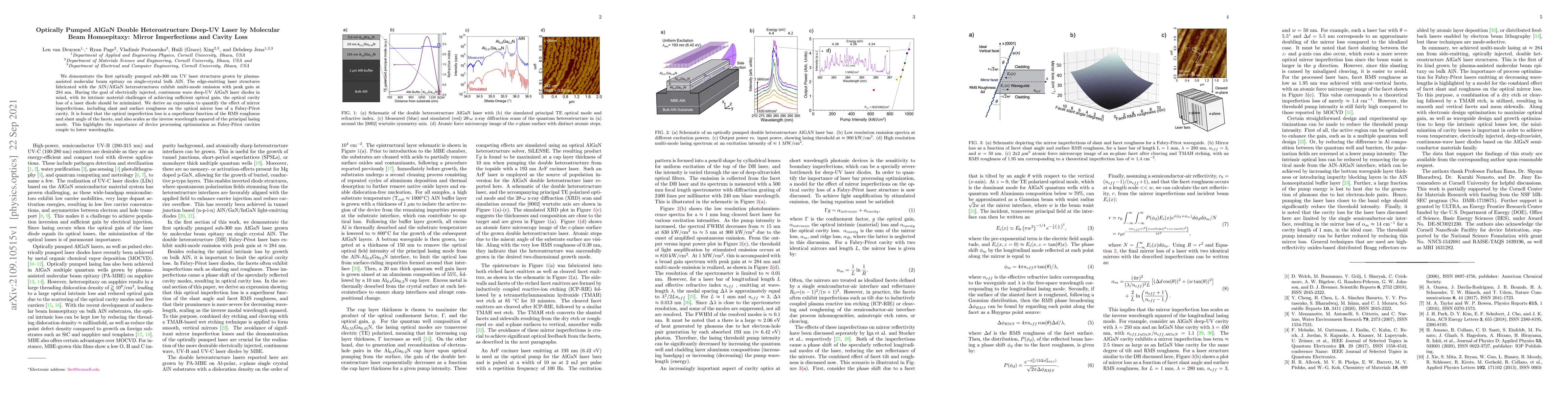 The paper presents the first optically pumped deep-UV laser structures grown on single-crystal bulk AlN, emitting at ~284 nm. It derives an expression to quantify mirror imperfection losses in Fabry-Pérot cavities, highlighting the superlinear relationship with RMS roughness and slant angle, and inverse wavelength squared, emphasizing the need for device processing optimization for lower wavelength lasers.