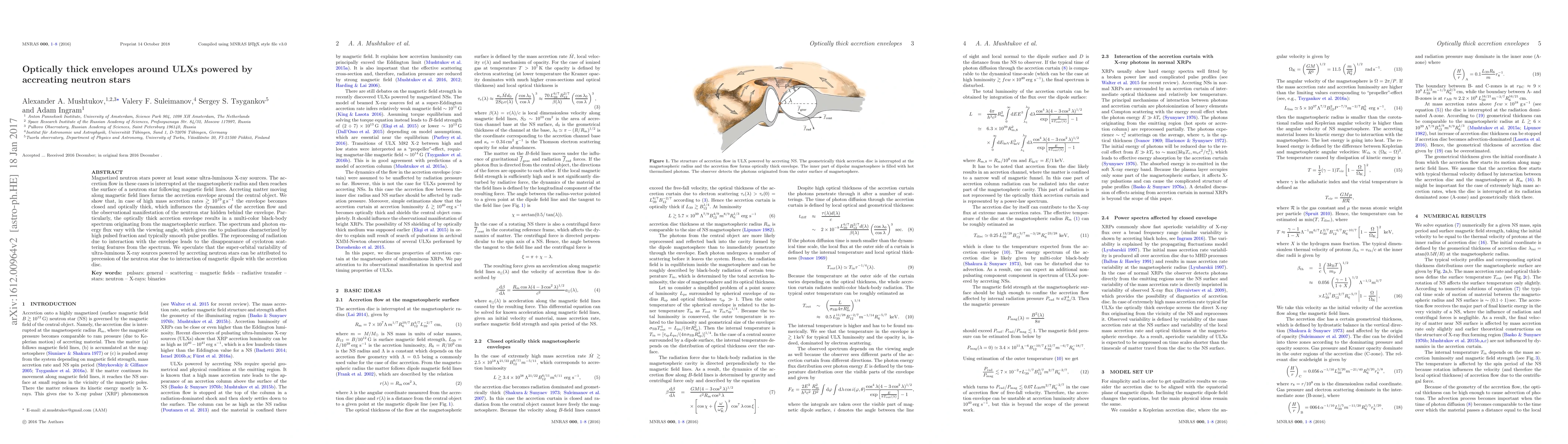 Magnetized neutron stars power at least some ultra-luminous X-ray sources. The accretion flow in these cases is interrupted at the magnetospheric radius and then reaches the surface of a neutron star following magnetic field lines. Accreting matter moving along magnetic field lines forms the accretion envelope around the central object. We show that, in case of high mass accretion rates $\gtrsim 10^{19}\,{\rm g\,s^{-1}}$ the envelope becomes closed and optically thick, which influences the dynamics of the accretion flow and the observational manifestation of the neutron star hidden behind the envelope. Particularly, the optically thick accretion envelope results in a multi-color black-body spectrum originating from the magnetospheric surface. The spectrum and photon energy flux vary with the viewing angle, which gives rise to pulsations characterized by high pulsed fraction and typically smooth pulse profiles. The reprocessing of radiation due to interaction with the envelope leads to the disappearance of cyclotron scattering features from the spectrum. We speculate that the super-orbital variability of ultra-luminous X-ray sources powered by accreting neutron stars can be attributed to precession of the neutron star due to interaction of magnetic dipole with the accretion disc.