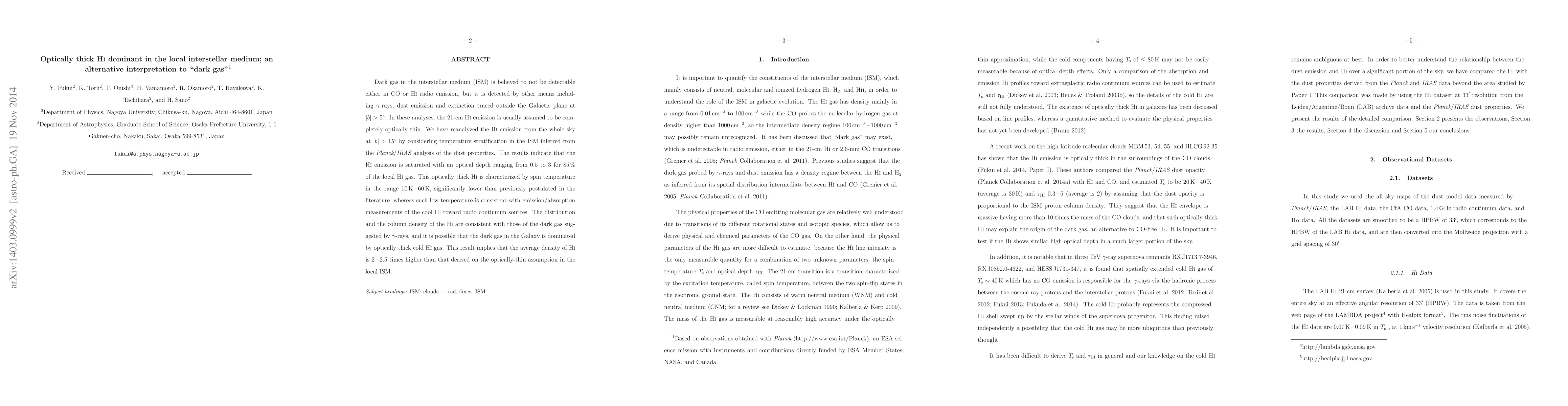Dark gas in the interstellar medium (ISM) is believed to not be detectable either in CO or Hi radio emission, but it is detected by other means including gamma-rays, dust emission and extinction traced outside the Galactic plane at |b|>5 degree. In these analyses, the 21-cm HI emission is usually assumed to be completely optically thin. We have reanalyzed the HI emission from the whole sky at |b|>15 degree by considering temperature stratification in the ISM inferred from the Planck/IRAS analysis of the dust properties. The results indicate that the HI emission is saturated with an optical depth ranging from 0.5 to 3 for 85% of the local HI gas. This optically thick HI is characterized by spin temperature in the range 10K-60K, significantly lower than previously postulated in the literature, whereas such low temperature is consistent with emission/absorption measurements of the cool HI toward radio continuum sources. The distribution and the column density of the HI are consistent with those of the dark gas sug- gested by gamma-rays, and it is possible that the dark gas in the Galaxy is dominated by optically thick cold HI gas. This result implies that the average density of HI is 2-2.5 times higher than that derived on the optically-thin assumption in the local ISM.