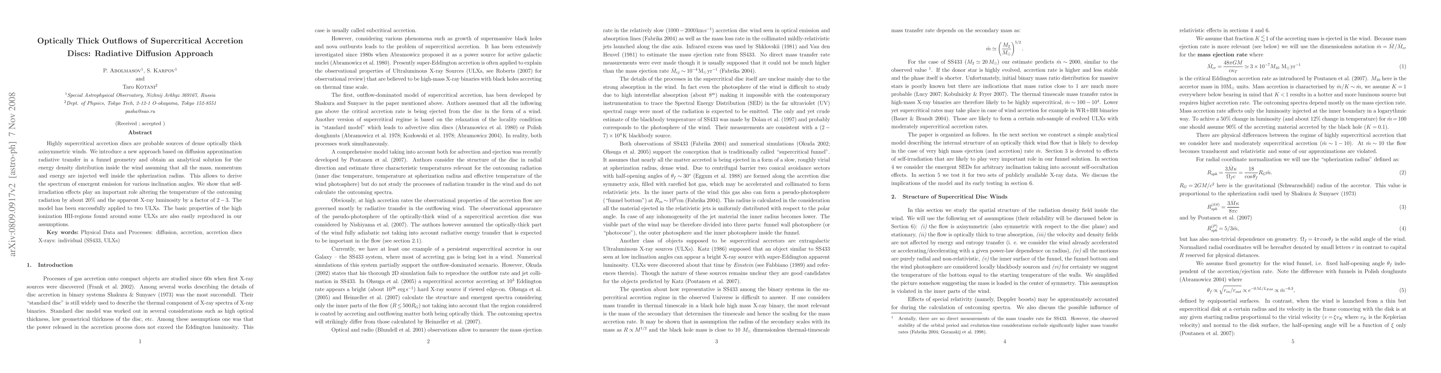 Highly supercritical accretion discs are probable sources of dense optically thick axisymmetric winds. We introduce a new approach based on diffusion approximation radiative transfer in a funnel geometry and obtain an analytical solution for the energy density distribution inside the wind assuming that all the mass, momentum and energy are injected well inside the spherization radius. This allows to derive the spectrum of emergent emission for various inclination angles. We show that self-irradiation effects play an important role altering the temperature of the outcoming radiation by about 20% and the apparent X-ray luminosity by a factor of 2-3. The model has been successfully applied to two ULXs. The basic properties of the high ionization HII-regions found around some ULXs are also easily reproduced in our assumptions.