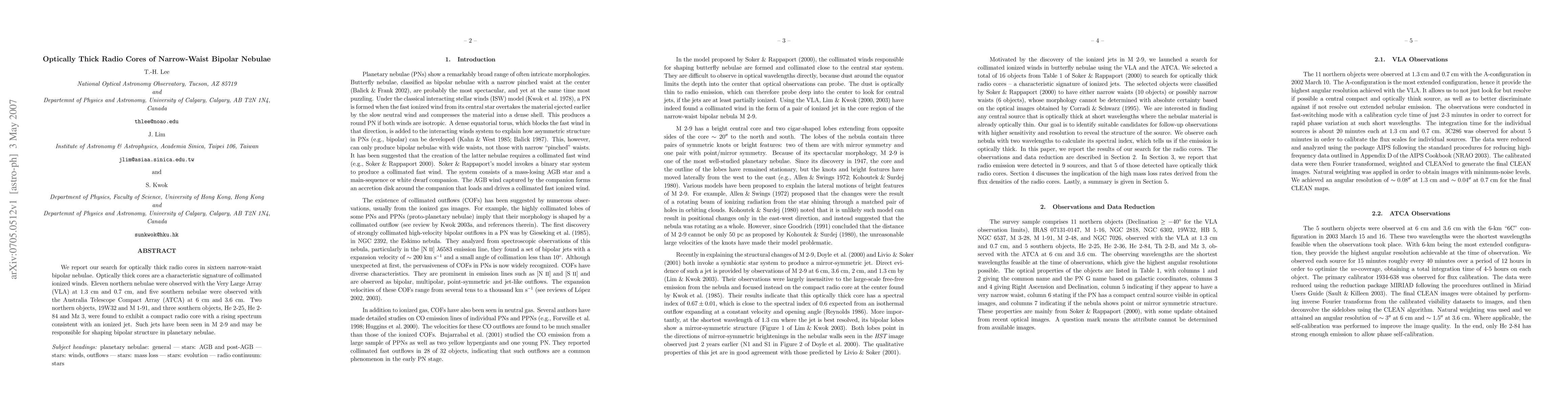 This study investigates the presence of optically thick radio cores in sixteen narrow-waist bipolar nebulae, identifying collimated ionized winds as a characteristic signature. Observations with VLA and ATCA revealed that five nebulae exhibit compact radio cores, suggesting the presence of ionized jets that may shape the bipolar structures in planetary nebulae.