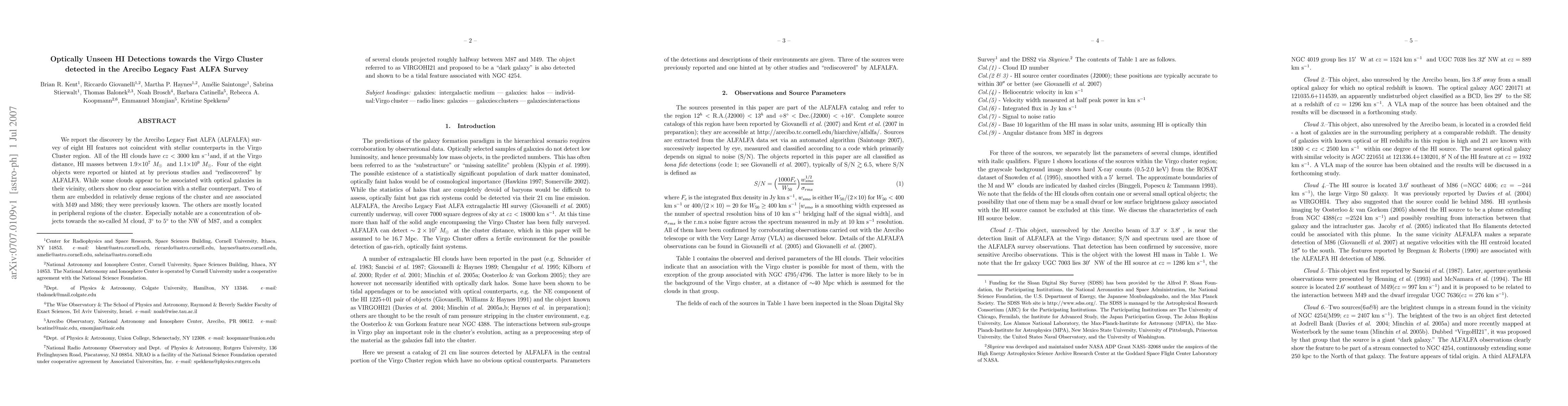 The Arecibo Legacy Fast ALFA (ALFALFA) survey discovered eight HI features in the Virgo Cluster without stellar counterparts, indicating the presence of unseen HI masses ranging from 1.9 x 10**7 to 1.1 x 10**9 solar masses. Notably, some objects are associated with known galaxies, while others remain "dark," including a cluster near the M cloud and a complex between M87 and M49.