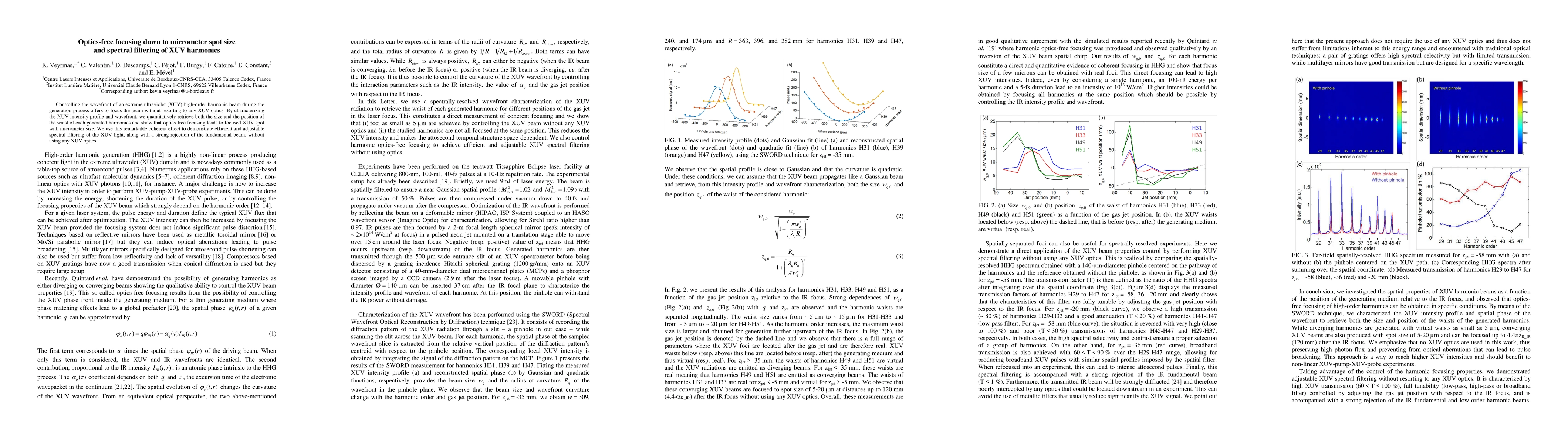 This study demonstrates optics-free focusing of extreme ultraviolet (XUV) high-order harmonics to micrometer spot sizes by controlling the beam's wavefront, without using XUV optics. It also shows efficient spectral filtering and fundamental beam rejection via this coherent effect.