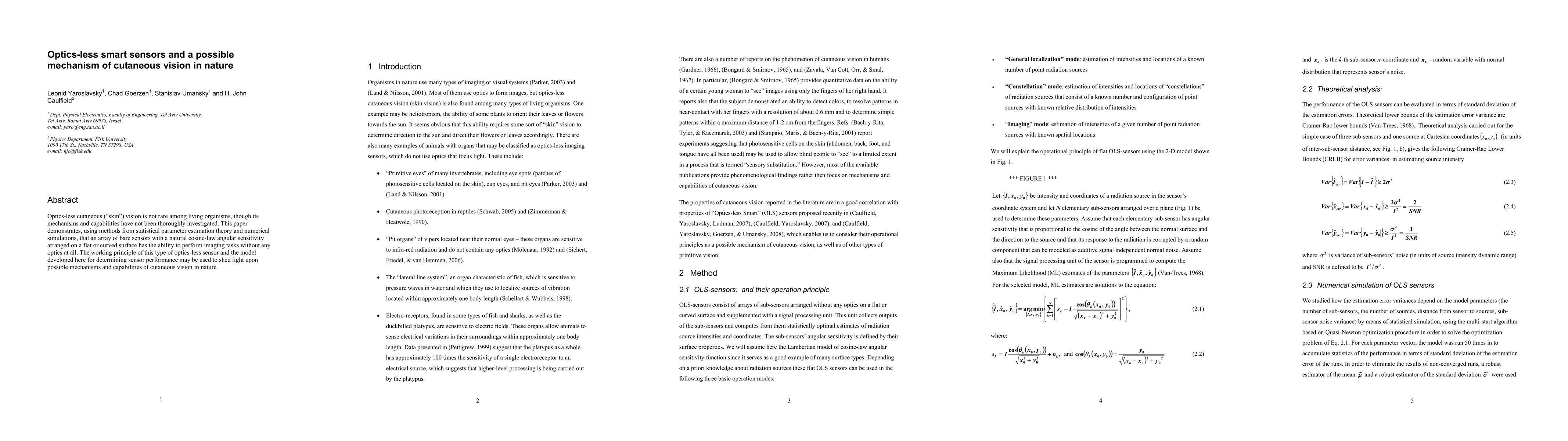 Optics-less cutaneous (skin) vision is not rare among living organisms, though its mechanisms and capabilities have not been thoroughly investigated. This paper demonstrates, using methods from statistical parameter estimation theory and numerical simulations, that an array of bare sensors with a natural cosine-law angular sensitivity arranged on a flat or curved surface has the ability to perform imaging tasks without any optics at all. The working principle of this type of optics-less sensor and the model developed here for determining sensor performance may be used to shed light upon possible mechanisms and capabilities of cutaneous vision in nature.