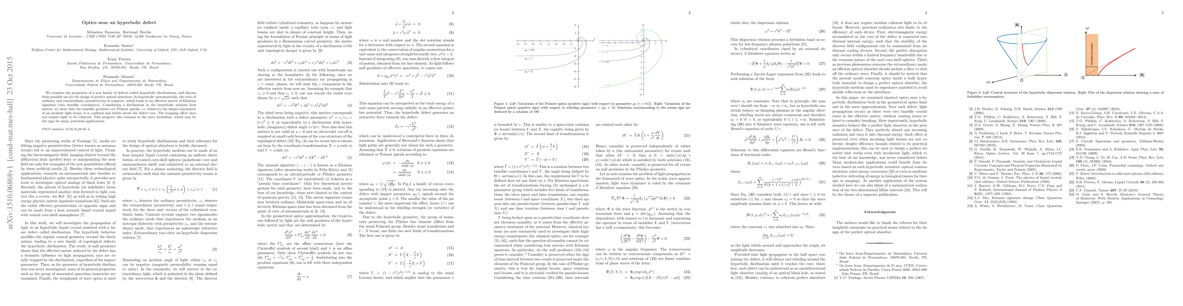 We examine the properties of a new family of defects called hyperbolic disclinations, and discuss their possible use for the design of perfect optical absorbers. In hyperbolic metamaterials, the ratio of ordinary and extraordinary permittivities is negative, which leads to an effective metric of Kleinian signature (two timelike coordinates). Considering a disclination in the hyperbolic nematic host matrix, we show that the timelike geodesics are Poinsot spirals, i.e. whatever the impact parameter of an incident light beam, it is confined and whirls about the defect core. The trapping effect does not require light to be coherent. This property also remains in the wave formalism, which may be the sign for many potential applications.