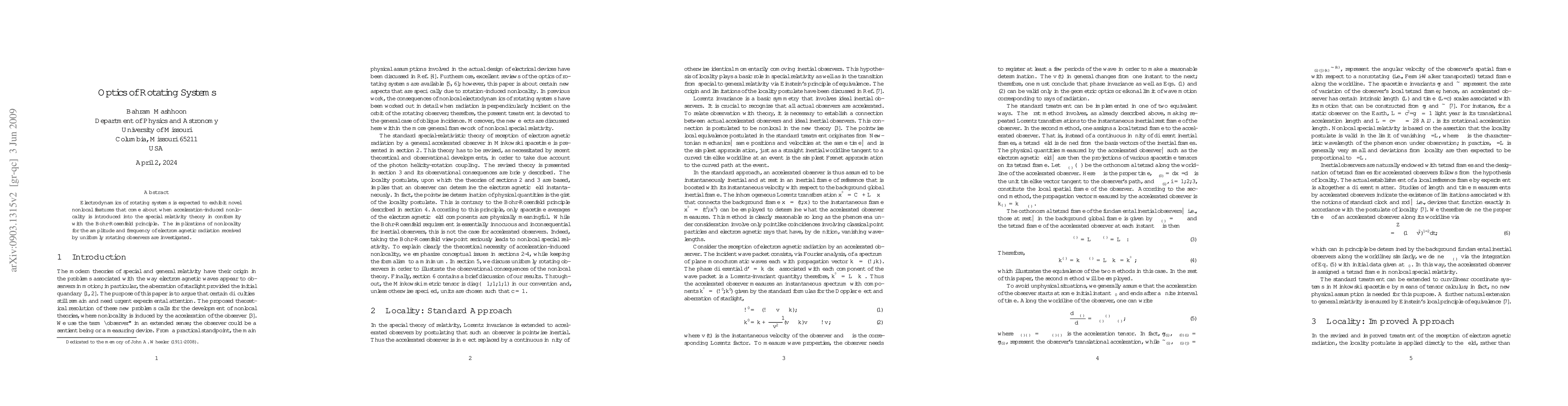 Electrodynamics of rotating systems is expected to exhibit novel nonlocal features that come about when acceleration-induced nonlocality is introduced into the special relativity theory in conformity with the Bohr-Rosenfeld principle. The implications of nonlocality for the amplitude and frequency of electromagnetic radiation received by uniformly rotating observers are investigated.
