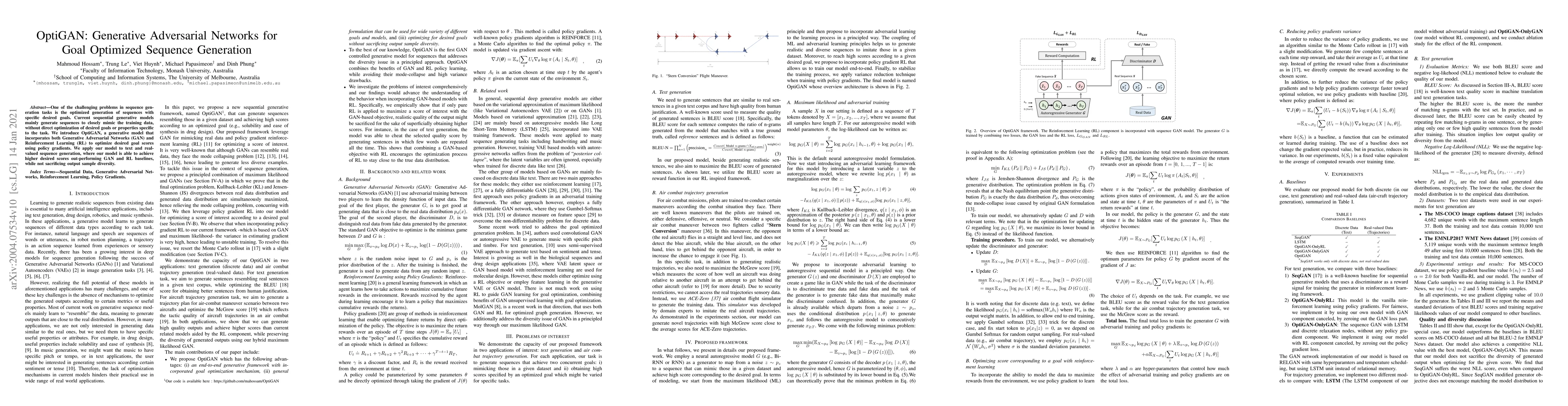 OptiGAN combines Generative Adversarial Networks and Reinforcement Learning to optimize sequence generation for specific goals, achieving higher goal scores than GAN or RL baselines without sacrificing diversity. The model is applied to text and real-valued sequence generation tasks.