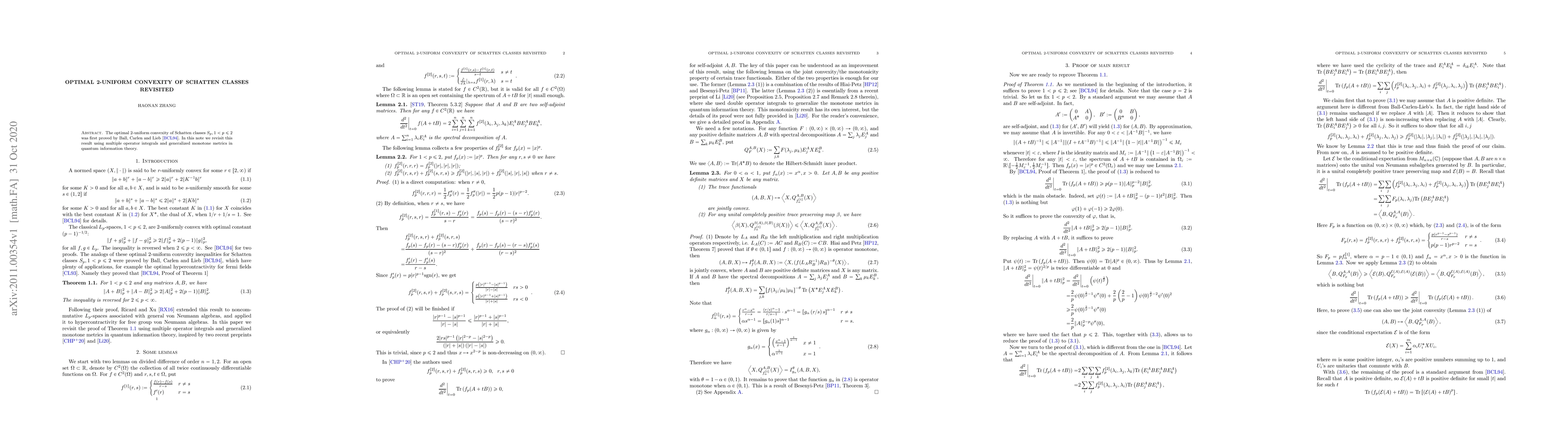 This paper revisits the optimal 2-uniform convexity of Schatten classes $S_p$ for $1<p\le 2$, originally proven by Ball, Carlen, and Lieb, employing multiple operator integrals and generalized monotone metrics from quantum information theory.