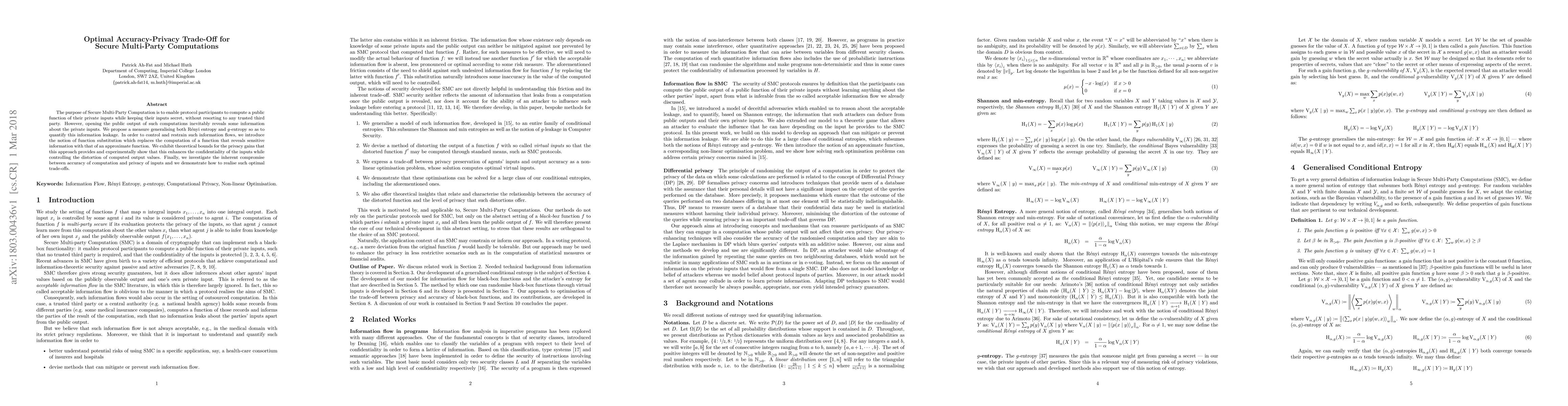 The purpose of Secure Multi-Party Computation is to enable protocol participants to compute a public function of their private inputs while keeping their inputs secret, without resorting to any trusted third party. However, opening the public output of such computations inevitably reveals some information about the private inputs. We propose a measure generalising both Renyi entropy and g-entropy so as to quantify this information leakage. In order to control and restrain such information flows, we introduce the notion of function substitution which replaces the computation of a function that reveals sensitive information with that of an approximate function. We exhibit theoretical bounds for the privacy gains that this approach provides and experimentally show that this enhances the confidentiality of the inputs while controlling the distortion of computed output values. Finally, we investigate the inherent compromise between accuracy of computation and privacy of inputs and we demonstrate how to realise such optimal trade-offs.