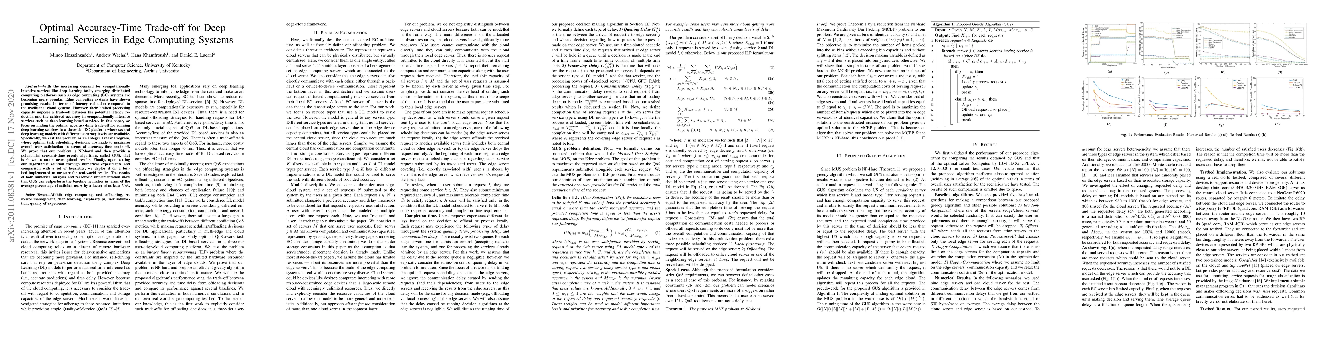 With the increasing demand for computationally intensive services like deep learning tasks, emerging distributed computing platforms such as edge computing (EC) systems are becoming more popular. Edge computing systems have shown promising results in terms of latency reduction compared to the traditional cloud systems. However, their limited processing capacity imposes a trade-off between the potential latency reduction and the achieved accuracy in computationally-intensive services such as deep learning-based services. In this paper, we focus on finding the optimal accuracy-time trade-off for running deep learning services in a three-tier EC platform where several deep learning models with different accuracy levels are available. Specifically, we cast the problem as an Integer Linear Program, where optimal task scheduling decisions are made to maximize overall user satisfaction in terms of accuracy-time trade-off. We prove that our problem is NP-hard and then provide a polynomial constant-time greedy algorithm, called GUS, that is shown to attain near-optimal results. Finally, upon vetting our algorithmic solution through numerical experiments and comparison with a set of heuristics, we deploy it on a test-bed implemented to measure for real-world results. The results of both numerical analysis and real-world implementation show that GUS can outperform the baseline heuristics in terms of the average percentage of satisfied users by a factor of at least 50%.