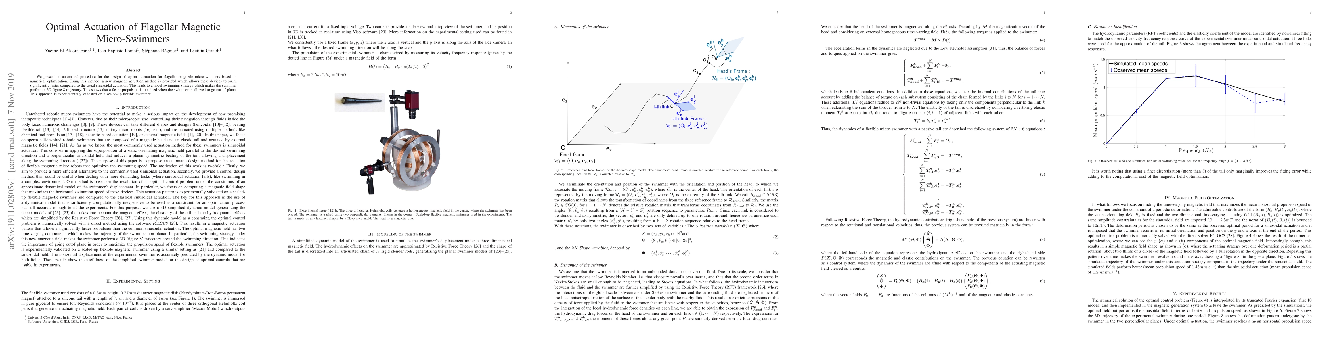 We present an automated procedure for the design of optimal actuation for flagellar magnetic microswimmers based on numerical optimization. Using this method, a new magnetic actuation method is provided which allows these devices to swim significantly faster compared to the usual sinusoidal actuation. This leads to a novel swimming strategy which makes the swimmer perform a 3D figure-8 trajectory. This shows that a faster propulsion is obtained when the swimmer is allowed to go out-of-plane. This approach is experimentally validated on a scaled-up flexible swimmer.