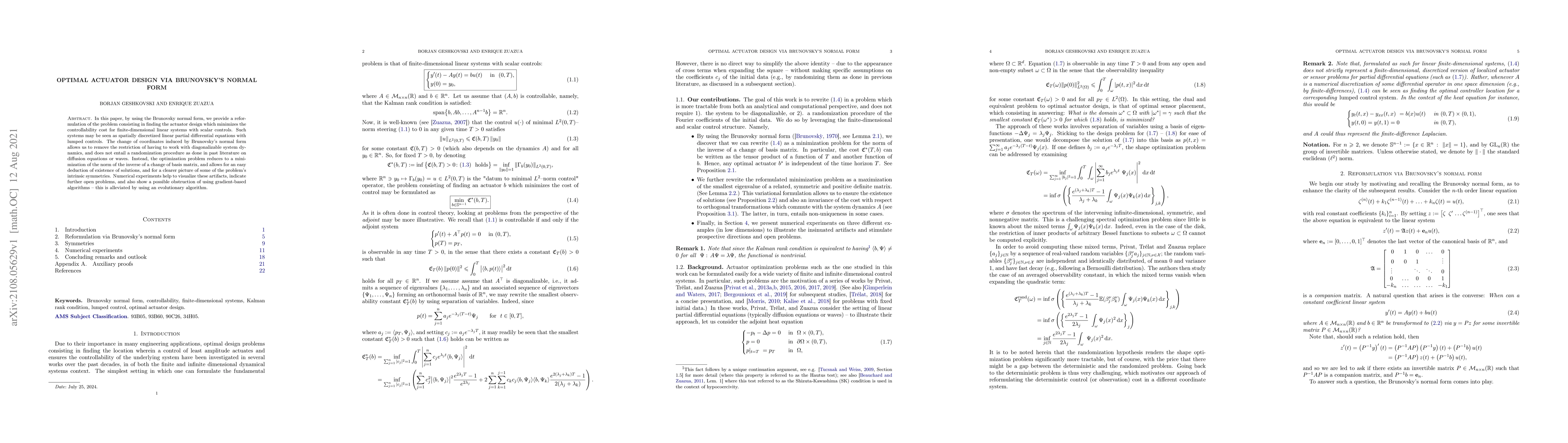 This research uses Brunovsky's normal form to reformulate actuator design optimization for linear systems with scalar controls, removing diagonalizability restrictions. It simplifies the problem to norm minimization of a change of basis matrix inverse, aiding solution existence proof and symmetry understanding, with numerical experiments suggesting obstructions for gradient-based algorithms and benefits of evolutionary algorithms.