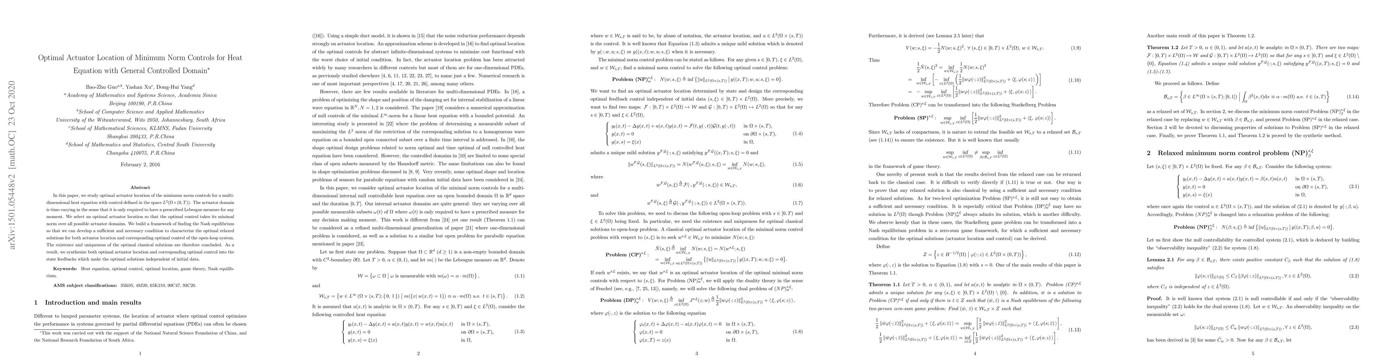 This paper explores the optimal placement of actuators for minimum norm controls in a multi-dimensional heat equation with general control domains. It formulates a relaxation problem and transforms it into a two-person zero-sum game, deriving a necessary and sufficient condition for the existence of relaxed optimal actuator locations, particularly for $p\in[2,+\infty]$.