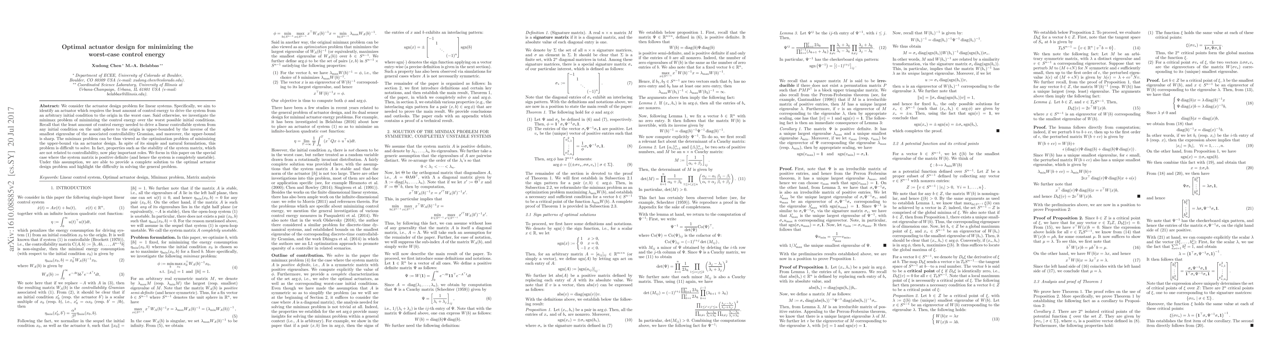 This paper addresses the optimal placement of an actuator in linear systems to minimize the worst-case control energy required to drive the system to the origin from any initial condition. It provides a solution for the special case where the system matrix is positive definite, highlighting the complexity of solving the general problem.