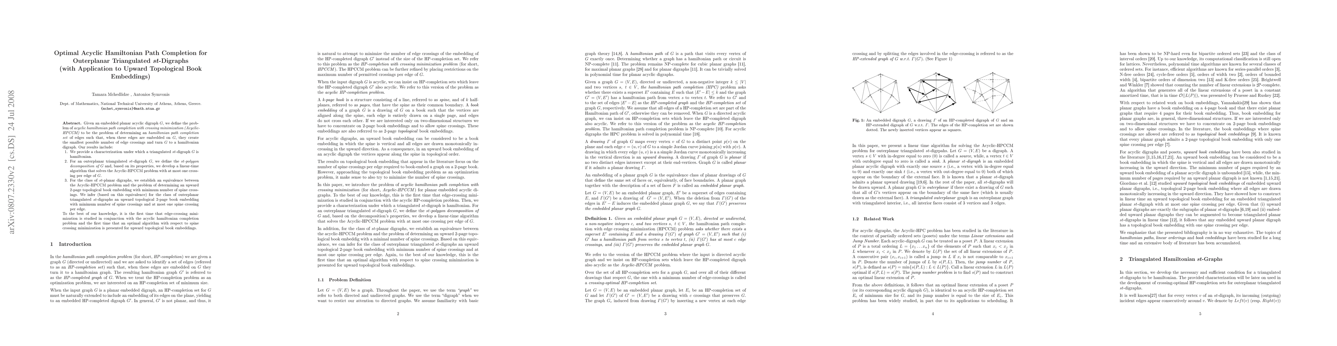Given an embedded planar acyclic digraph G, we define the problem of "acyclic hamiltonian path completion with crossing minimization (Acyclic-HPCCM)" to be the problem of determining an hamiltonian path completion set of edges such that, when these edges are embedded on G, they create the smallest possible number of edge crossings and turn G to a hamiltonian digraph. Our results include: --We provide a characterization under which a triangulated st-digraph G is hamiltonian. --For an outerplanar triangulated st-digraph G, we define the st-polygon decomposition of G and, based on its properties, we develop a linear-time algorithm that solves the Acyclic-HPCCM problem with at most one crossing per edge of G. --For the class of st-planar digraphs, we establish an equivalence between the Acyclic-HPCCM problem and the problem of determining an upward 2-page topological book embedding with minimum number of spine crossings. We infer (based on this equivalence) for the class of outerplanar triangulated st-digraphs an upward topological 2-page book embedding with minimum number of spine crossings and at most one spine crossing per edge. To the best of our knowledge, it is the first time that edge-crossing minimization is studied in conjunction with the acyclic hamiltonian completion problem and the first time that an optimal algorithm with respect to spine crossing minimization is presented for upward topological book embeddings.