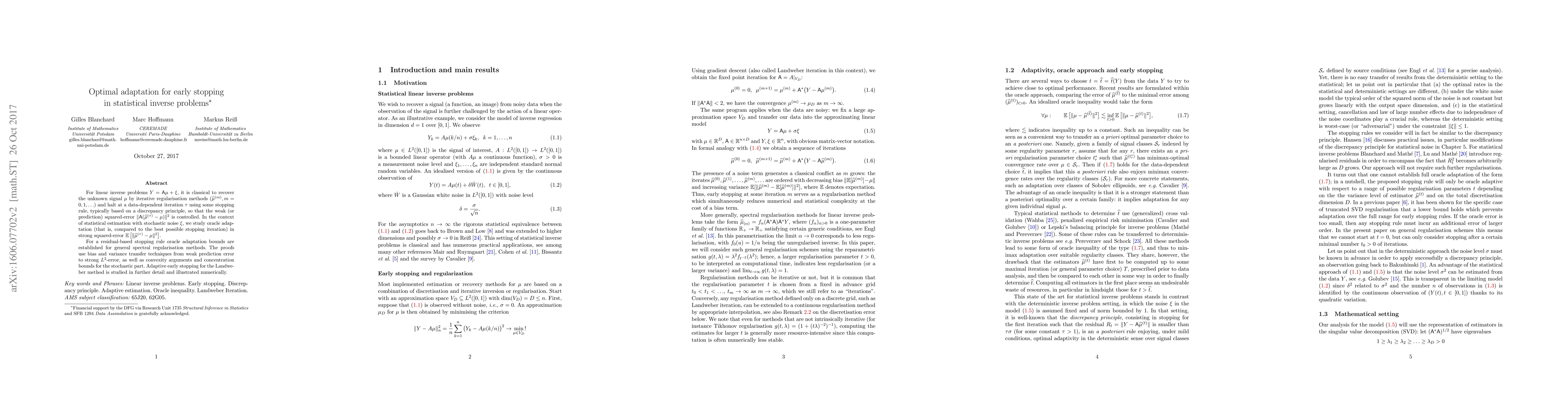 For linear inverse problems $Y=\mathsf{A}\mu+\xi$, it is classical to recover the unknown signal $\mu$ by iterative regularisation methods $(\widehat \mu^{(m)}, m=0,1,\ldots)$ and halt at a data-dependent iteration $\tau$ using some stopping rule, typically based on a discrepancy principle, so that the weak (or prediction) squared-error $\|\mathsf{A}(\widehat \mu^{(\tau)}-\mu)\|^2$ is controlled. In the context of statistical estimation with stochastic noise $\xi$, we study oracle adaptation (that is, compared to the best possible stopping iteration) in strong squared-error $E[\|\hat \mu^{(\tau)}-\mu\|^2]$. For a residual-based stopping rule oracle adaptation bounds are established for general spectral regularisation methods. The proofs use bias and variance transfer techniques from weak prediction error to strong $L^2$-error, as well as convexity arguments and concentration bounds for the stochastic part. Adaptive early stopping for the Landweber method is studied in further detail and illustrated numerically.