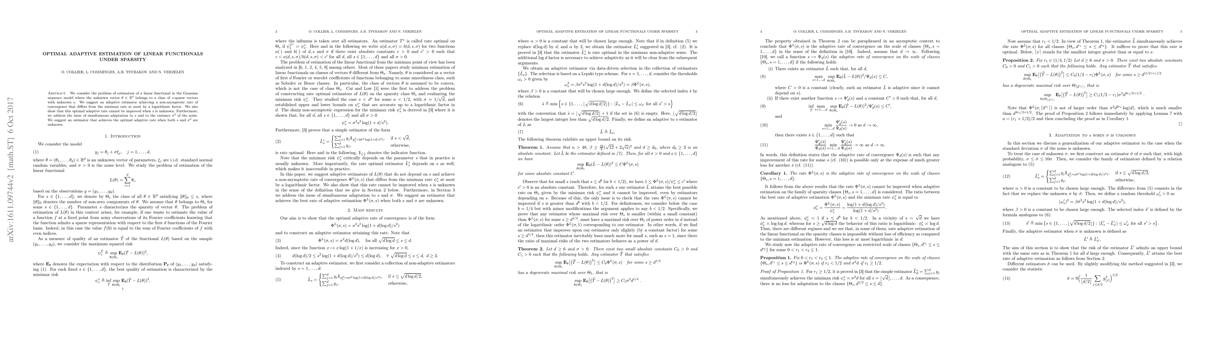 This paper proposes an adaptive estimator for sparse linear functionals in Gaussian sequence models, achieving a near-optimal convergence rate that differs from the minimax rate by a logarithmic factor. The authors also develop an estimator that optimally adapts to both the sparsity level and noise variance when both are unknown.