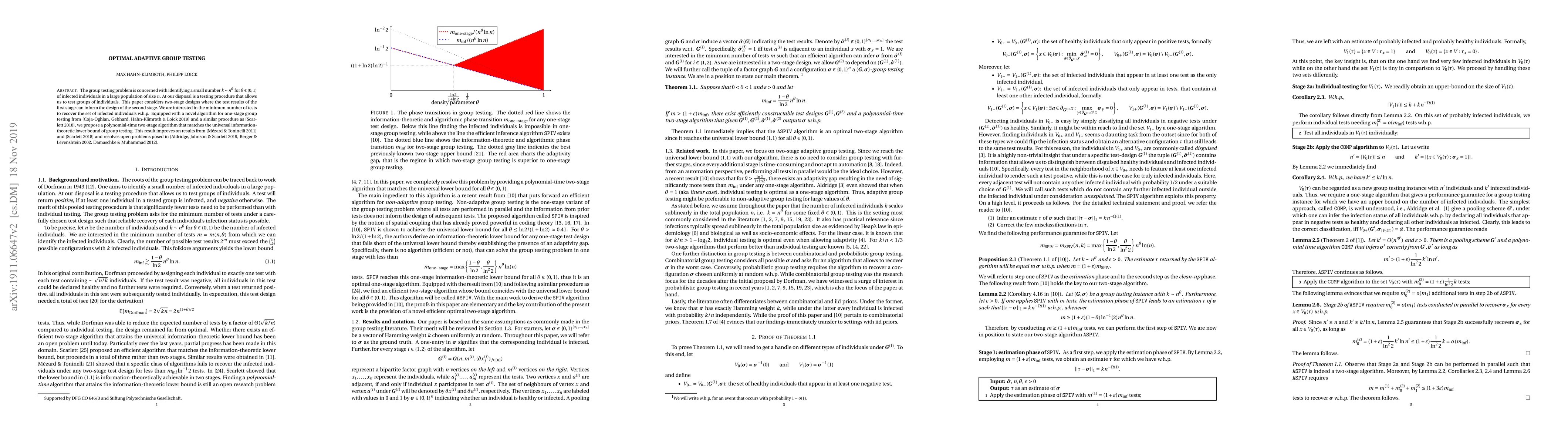 This paper proposes a polynomial-time two-stage algorithm for adaptive group testing that minimizes the number of tests required to identify a small subset of infected individuals within a large population, matching the universal information-theoretic lower bound. This approach improves upon previous results and resolves several open problems in the field.