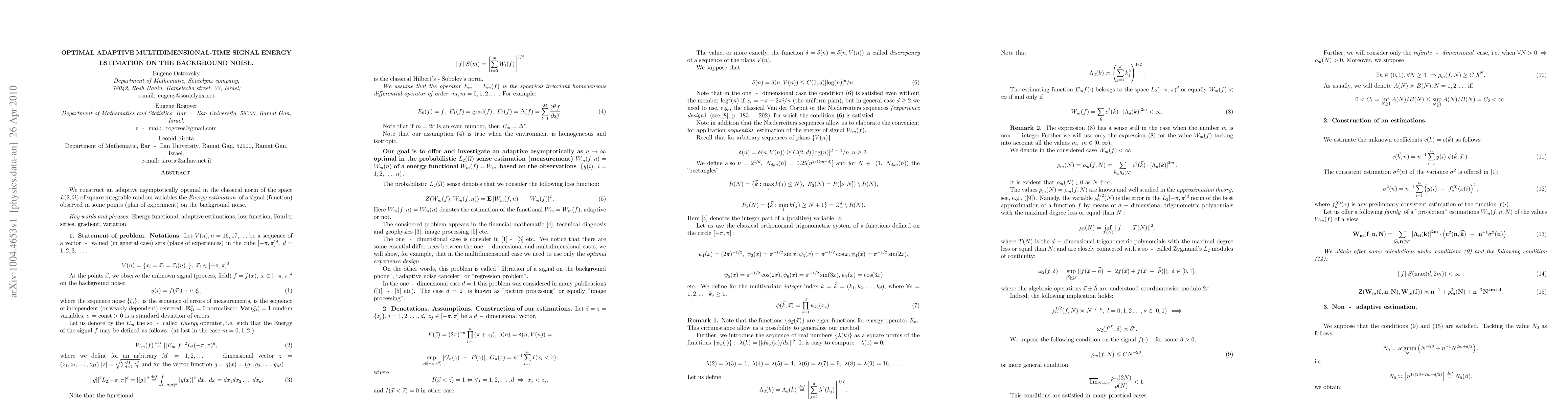 Summary: This paper develops an adaptive method for optimally estimating the energy of a signal observed at specific points amidst background noise, ensuring asymptotic optimality in the L(2,Ω) space of square integrable random variables. The approach aims to provide accurate signal energy estimations under varying noise conditions.
