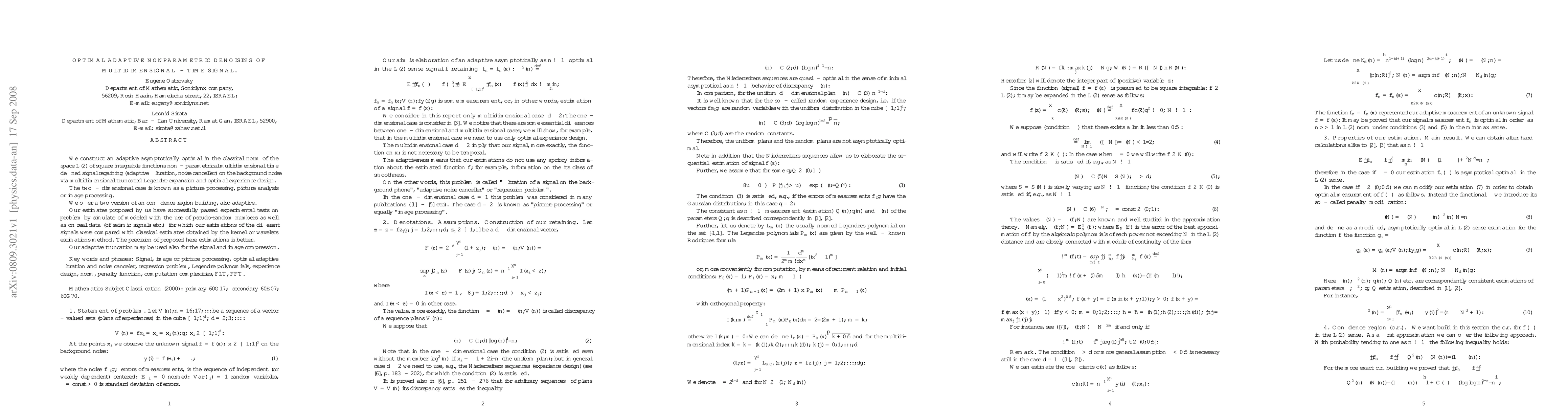 This paper proposes an adaptive, nonparametric denoising method for multidimensional time signals using multidimensional truncated Legendre expansion. The method outperforms classical kernel or wavelet estimation methods in precision, as demonstrated through simulations and real-world data like seismic signals.