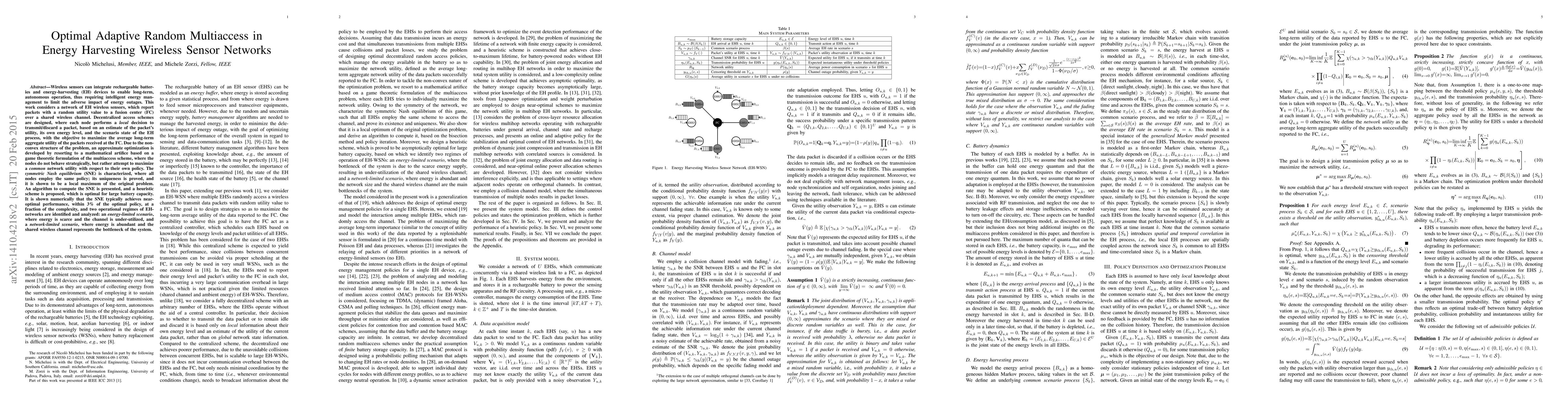 This paper presents an optimal adaptive random multiaccess scheme for energy-harvesting wireless sensor networks, achieving near-optimal performance with reduced complexity, and identifying two operational regimes: energy-limited and network-limited scenarios.