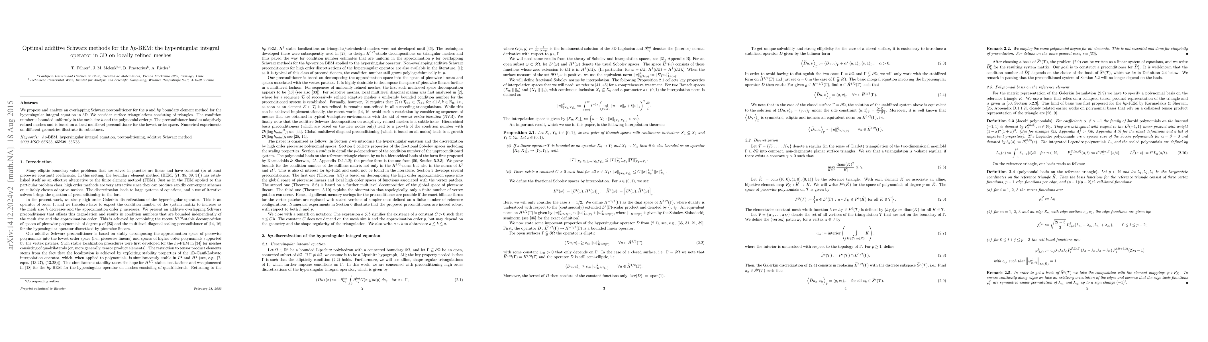 The paper introduces an overlapping Schwarz preconditioner for the $p$ and $hp$ boundary element method addressing the hypersingular integral equation in 3D. The method ensures the condition number remains bounded regardless of mesh size $h$ or polynomial order $p$, demonstrating robustness through numerical experiments on various geometries.