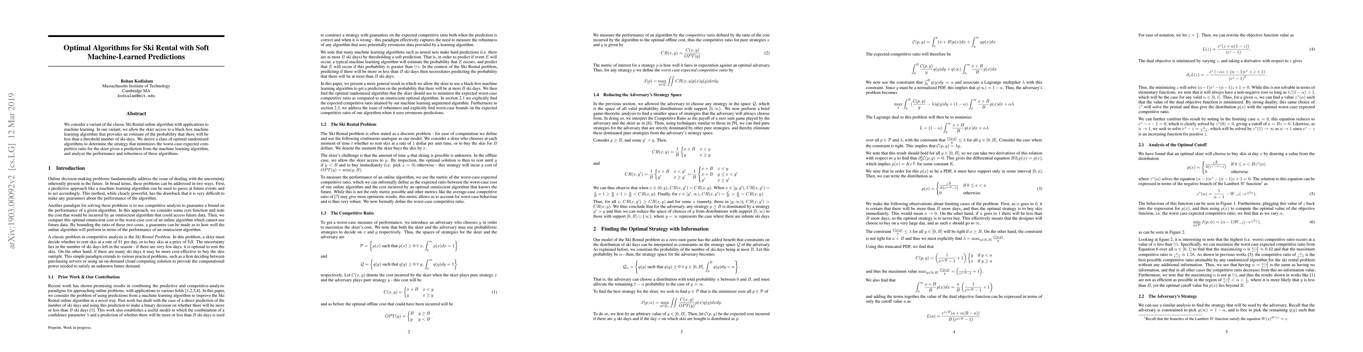 We consider a variant of the classic Ski Rental online algorithm with applications to machine learning. In our variant, we allow the skier access to a black-box machine-learning algorithm that provides an estimate of the probability that there will be at most a threshold number of ski-days. We derive a class of optimal randomized algorithms to determine the strategy that minimizes the worst-case expected competitive ratio for the skier given a prediction from the machine learning algorithm,and analyze the performance and robustness of these algorithms.